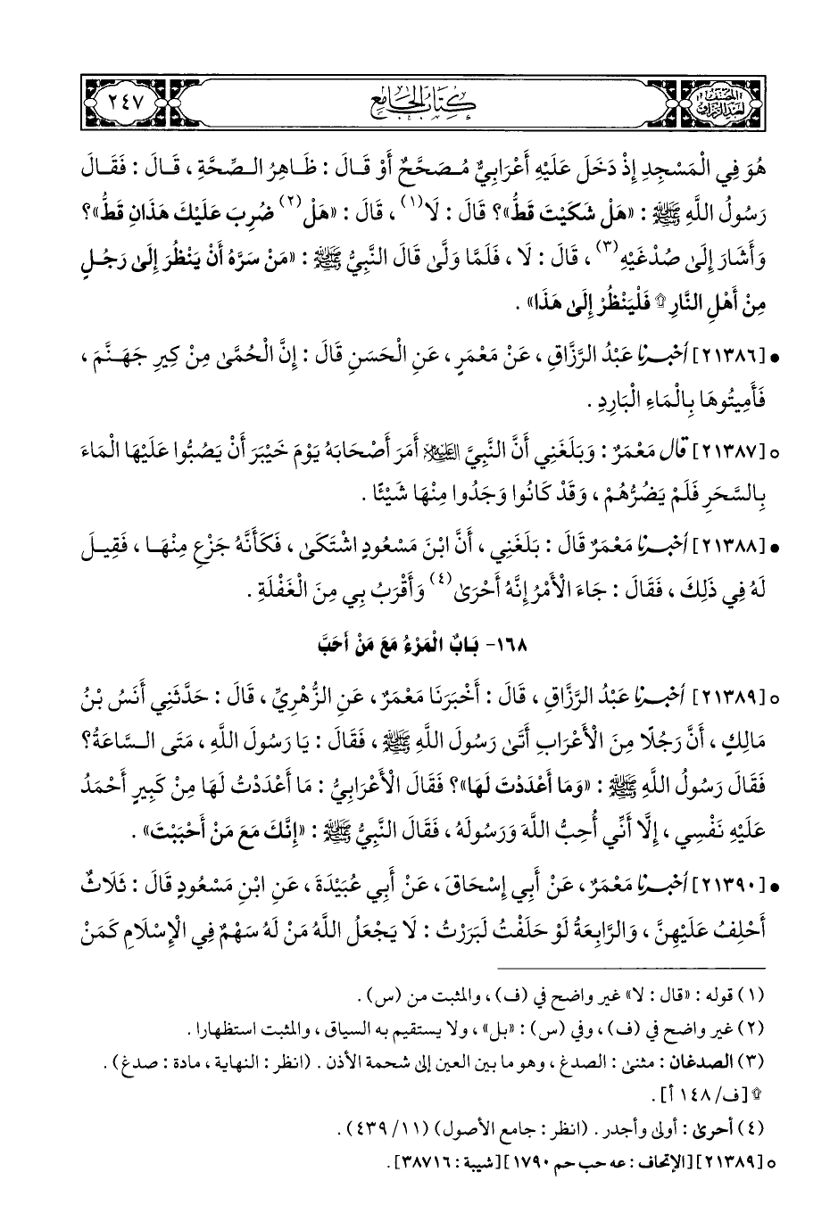 ° [٢١٣٨٩] أخبرنا عَبْدُ الرَّزَّاقِ، قَالَ: أَخْبَرَنَا مَعْمَرٌ، عَنِ الزُّهْرِيِّ، قَالَ: حَدَّثَنِي أَنَسُ بْنُ مَالِكٍ، أَنَّ رَجُلًا مِنَ الْأَعْرَابِ أَتَى رَسُولَ اللَّهِ - صلى الله عليه وسلم -، فَقَالَ: يَا رَسُولَ اللَّهِ، مَتَى السَّاعَةُ؟ فَقَالَ رَسُولُ اللَّهِ - صلى الله عليه وسلم -: "وَمَا أَعْدَدْتَ لَهَا"؟ فَقَالَ الْأَعْرَابِيُّ: مَا أَعْدَدْتُ لَهَا مِنْ كَبِيرٍ أَحْمَدُ عَلَيْهِ نَفْسِي، إِلَّا أَنِّي أُحِبُّ اللَّهَ وَرَسُولَهُ، فَقَالَ النَّبِيُّ - صلى الله عليه وسلم -: "إِنَّكَ مَعَ مَنْ أَحْبَبْتَ".