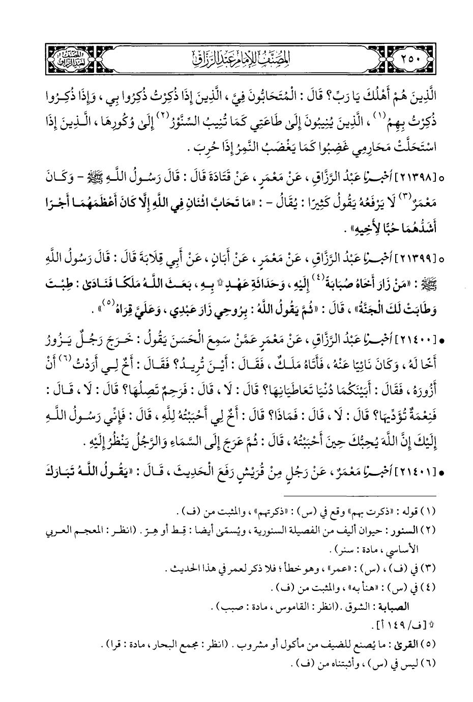 ° [٢١٣٩٨] أخبرنا عَبْدُ الرَّزَاقِ، عَنْ مَعْمَرٍ، عَنْ قَتَادَةَ قَالَ: قَالَ رَسُولُ اللهِ - صلى الله عليه وسلم - - وَكَانَ مَعْمَرٌ (¬٣) لَا يَرْفَعُهُ يَقُولُ كَثِيرًا: يُقَالُ -: "مَا تَحَابَّ اثنَانِ فِي اللَّهِ إِلَّا كَانَ أَعْظَمَهُمَا أَجْرًا أَشَدُّهُمَا حُبًّا لِأَخِيهِ".
