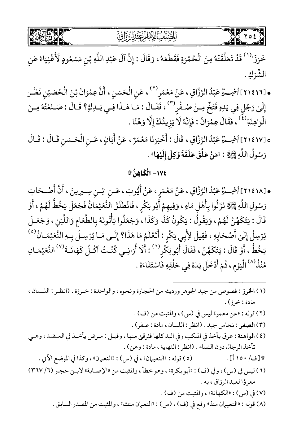 • [٢١٤١٨] أخبرنا عَبْدُ الرَّزَّاقِ، عَنْ مَعْمَرٍ، عَنْ أَيُّوبَ، عَنِ ابْنِ سِيرِينَ، أَنَّ أَصْحَابَ رَسُولِ اللَّهِ - صلى الله عليه وسلم - نَزَلُوا بِأَهْلِ مَاءٍ، وَفِيهِمْ أَبُو بَكْرٍ، فَانْطَلَقَ النُّعَيْمَانُ فَجَعَلَ يَخُطُّ لَهُمْ، أَوْ قَالَ: يَتَكَهَّنُ لَهُمْ، وَيَقُولُ: يَكُونُ كَذَا وَكَذَا، وَجَعَلُوا يَأْتُونَهُ بِالطَّعَامِ وَاللَّبَنِ، وَجَعَلَ يُرسِلُ إِلَى أَصْحَابِهِ، فَقِيلَ لِأَبِي بَكْرٍ: أَتَعْلَمُ مَا هَذَا؟ إِلَى مَا يُرسِلُ بِهِ النُّعَيْمَانُ (¬٥) يَخُطُّ، أَوْ قَالَ: يَتَكَهَّنُ، فَقَالَ أَبُو بَكْرٍ (¬٦): أَلَا أُرَانِي كُنْتُ آكُلُ كَهَانَةَ (¬٧) النُّعَيْمَانِ مُنْذُ (¬٨) الْيَوْمِ، ثُمَّ أَدْخَلَ يَدَهُ فِي حَلْقِهِ فَاسْتَقَاءَهُ.