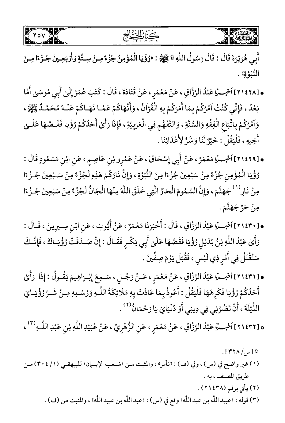 • [٢١٤٢٩] أخبرنا مَعْمَرٌ، عَنْ أَبِي إِسْحَاقَ، عَنْ عَمْرِو بْنِ عَاصِمٍ، عَنِ ابْنِ مَسْعُودٍ قَالَ: رُؤْيَا الْمُؤْمِنِ جُزْءٌ مِنْ سَبْعِينَ جُزْءًا مِنَ النُّبُوَّةِ، وإنَّ نَارَكُمْ هَذِهِ لَجُزْءٌ مِنْ سَبْعِينَ جُزْءًا مِنْ نَارِ (¬١) جَهَنَّمَ، وإِنَّ السَّمُومَ الْحَارَّ الَّتِي خَلَقَ اللَّهُ مِنْهَا الْجَانَّ لَجُزْءٌ مِنْ سَبْعِينَ جُزْءًا مِنْ حَرِّ جَهَنَّمَ.