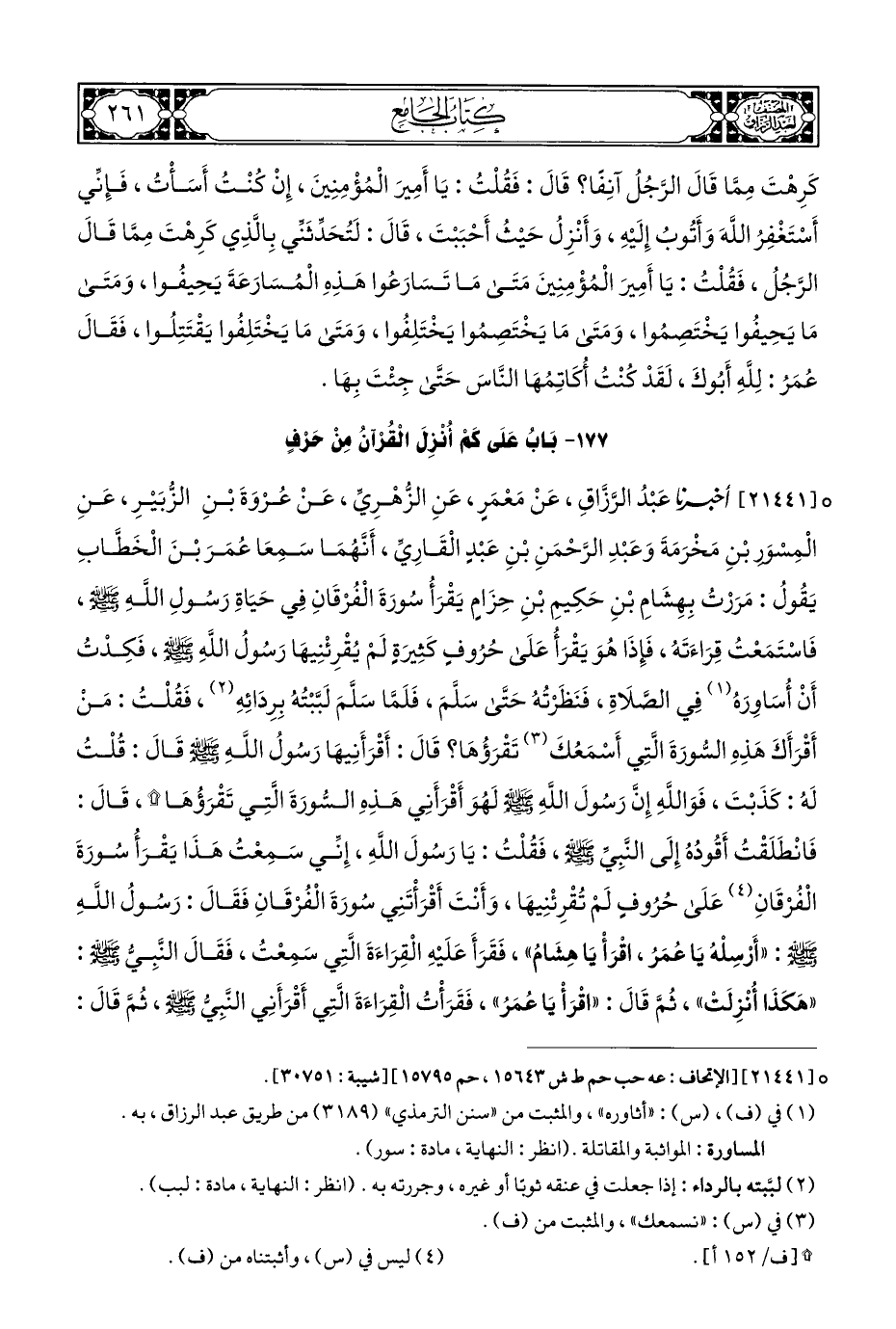 ° [٢١٤٤١] أخبرنا عَبْدُ الرَّزَّاقِ، عَنْ مَعْمَرٍ، عَنِ الزُّهْرِيِّ، عَنْ عُرْوَةَ بْنِ الزُّبَيْرِ، عَنِ الْمِسْوَرِ بْنِ مَخْرَمَةَ وَعَبْدِ الرَّحْمَنِ بْنِ عَبْدٍ الْقَارِيِّ، أَنَّهُمَا سَمِعَا عُمَرَ بْنَ الْخَطَّابِ يَقُولُ: مَرَرْتُ بِهِشَامِ بْنِ حَكِيمِ بْنِ حِزَامٍ يَقْرَأُ سُورَةَ الْفُرْقَانِ فِي حَيَاةِ رَسُولِ اللَّهِ - صلى الله عليه وسلم -، فَاسْتَمَعْتُ قِرَاءَتَهُ، فَإِذَا هُوَ يَقْرَأُ عَلَى حُرُوفٍ كَثِيرَةٍ لَمْ يُقْرِئْنِيهَا رَسُولُ اللهِ - صلى الله عليه وسلم -، فَكِدْتُ أَنْ أُسَاوِرَهُ (¬١) فِي الصَّلَاةِ، فَنَظَرتُهُ حَتَّى سَلَّمَ، فَلَمَّا سَلَّمَ لَبَّبْتُهُ بِرِدَائِهِ (¬٢)، فَقُلْتُ: مَنْ أَقْرَأَكَ هَذِهِ السُّورَةَ الَّتِي أَسْمَعُكَ (¬٣) تَقْرَؤُهَا؟ قَالَ: أَقْرَأَنِيهَا رَسُولُ اللَّهِ - صلى الله عليه وسلم - قَالَ: قُلْتُ لَهُ: كَذَبْتَ، فَوَاللَّهِ إِنَّ رَسُولَ اللَّهِ - صلى الله عليه وسلم - لَهُوَ أَقْرَأَنِي هَذِهِ السُّورَةَ الَّتِي تَقْرَؤُهَا *، قَالَ: فَانْطَلَقْتُ أَقُودُهُ إِلَى النَّبِيِّ - صلى الله عليه وسلم -، فَقُلْتُ: يَا رَسُولَ اللَّهِ، إِنِّي سَمِعْتُ هَذَا يَقْرَأُ سُورَةَ الْفُرْقَانِ (¬٤) عَلَى حُرُوفٍ لَمْ تُقْرِئْنِيهَا، وَأَنْتَ أَقْرَأْتَنِي سُورَةَ الْفُرْقَانِ فَقَالَ: رَسُولُ اللَّهِ - صلى الله عليه وسلم -: "أَرْسِلْهُ يَا عُمَرُ، اقْرَأْ يَا هِشَامُ"، فَقَرَأَ عَلَيْهِ الْقِرَاءَةَ الَّتِي سَمِعْتُ، فَقَالَ النَّبِيّ - صلى الله عليه وسلم -: "هَكَذَا أُنْزِلَتْ"، ثُمَّ قَالَ: "اقْرَأْ يَا عُمَرُ"، فَقَرَأْتُ الْقِرَاءَةَ الَّتِي أَقْرَأَنِي النَّبِيُّ - صلى الله عليه وسلم -، ثُمَّ قَالَ:
