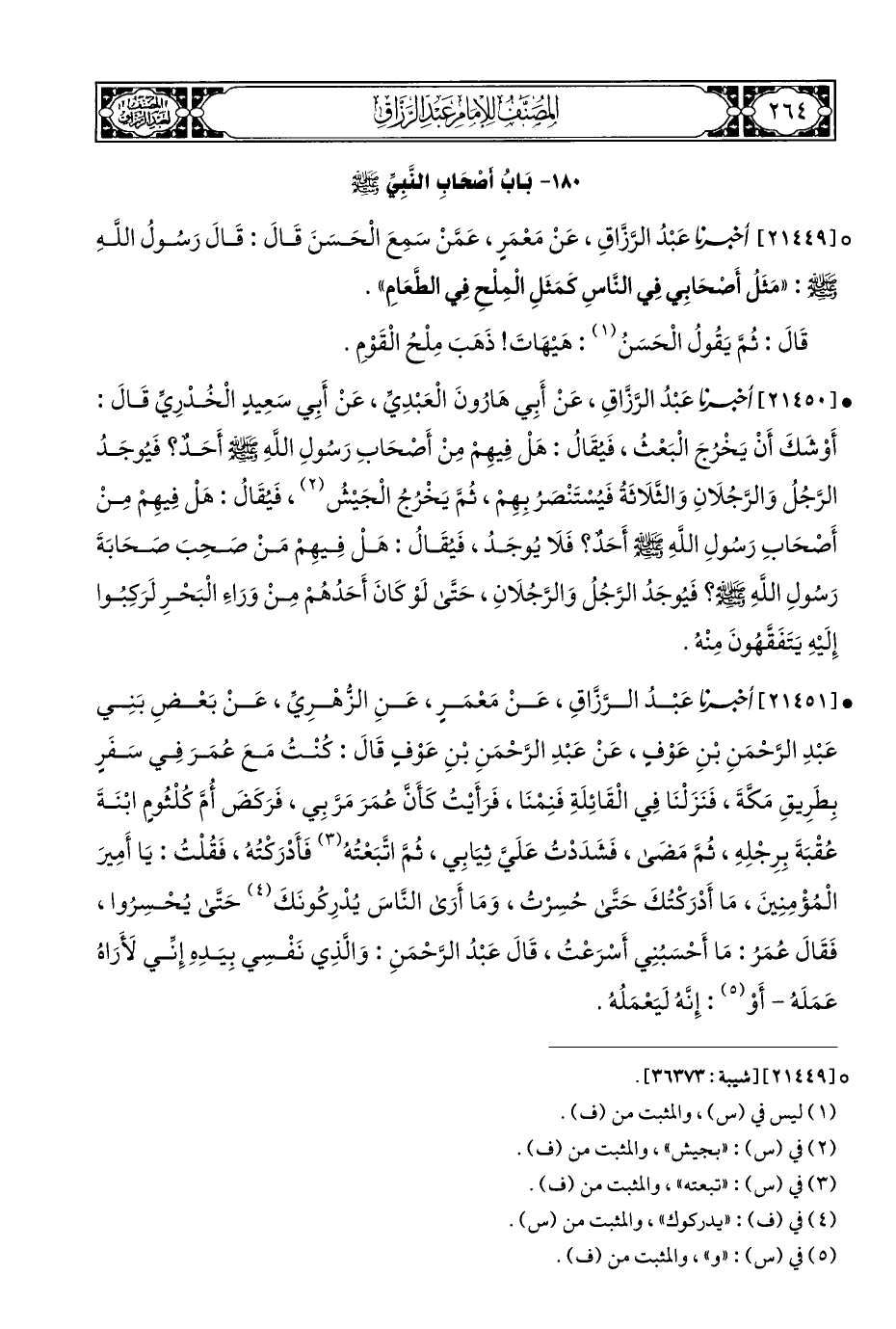 ° [٢١٤٤٩] أخبرنا عَبْدُ الرَّزَّاقِ، عَنْ مَعْمَرٍ، عَمَّنْ سَمِعَ الْحَسَنَ قَالَ: قَالَ رَسُولُ اللَّهِ - صلى الله عليه وسلم -: "مَثَلُ أَصْحَابِي فِي النَّاسِ كمَثَلِ الْمِلْحِ فِي الطَّعَامِ".