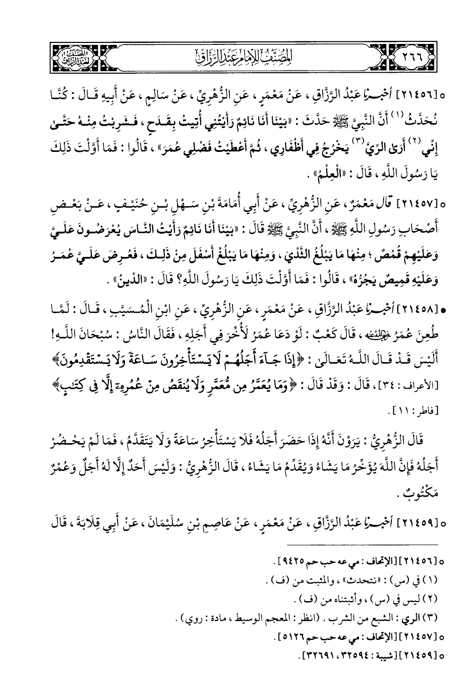 ° [٢١٤٥٦] أخبرنا عَبْدُ الرَّزَّاقِ، عَنْ مَعْمَرٍ، عَنِ الزُّهْرِيِّ، عَنْ سَالِمٍ، عَنْ أَبِيهِ قَالَ: كُنَّا نُحَدَّثُ (¬١) أَنَّ النَّبِيَّ - صلى الله عليه وسلم - حَدَّثَ: "بَيْنَا أَنَا نَائِمٌ رَأَيْتُنِي أُتِيتُ بِقَدَحٍ، فَشَرِبْتُ مِنْهُ حَتَّى إِنِّي (¬٢) أَرَى الرَّيَّ (¬٣) يَخْرُجُ فِي أَظْفَارِي، ثُمَّ أَعْطَيْتُ فَضْلِي عُمَرَ"، قَالُوا: فَمَا أَوَّلْتَ ذَلِكَ يَا رَسُولَ اللَّهِ، قَالَ: "الْعِلْمُ".