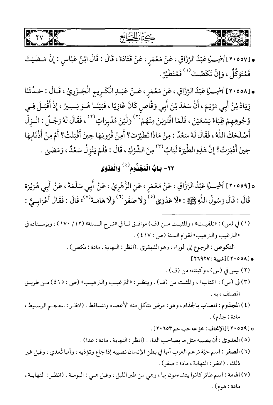 ° [٢٠٥٥٩] أخبرنا عَبْدُ الرَّزَّاقِ، عَنْ مَعْمَرٍ، عَنِ الزُّهْرِيِّ، عَنْ أَبِي سَلَمَةَ، عَنْ أَبِي هُرَيْرَةَ قَالَ: قَالَ رَسُولُ اللهِ - صلى الله عليه وسلم -: "لَا عَدْوَى (¬٥) وَلَا صَفَرَ (¬٦) وَلَا هَامَةَ (¬٧) " قَالَ: فَقَالَ أَعْرَابِيٌّ: