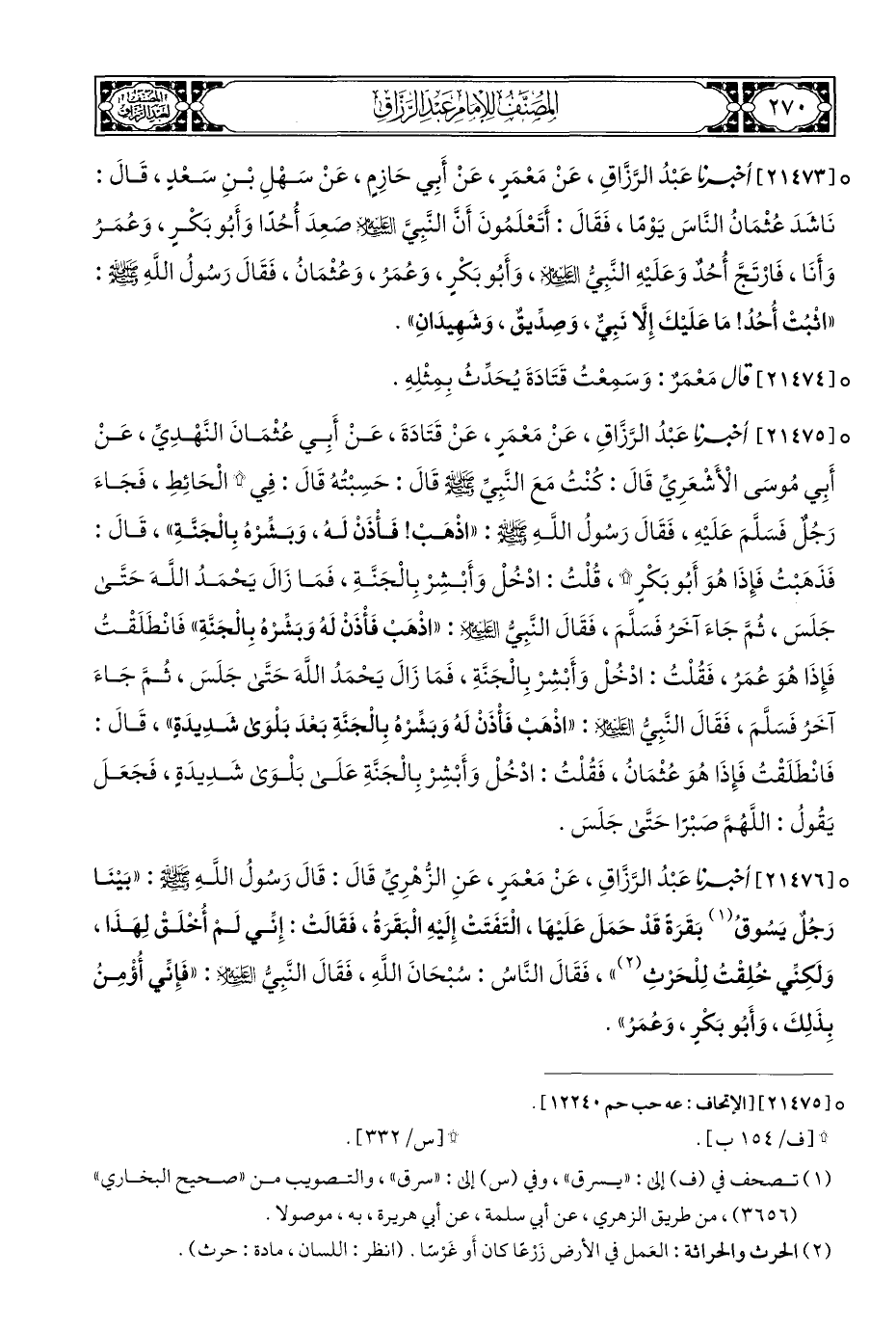 ° [٢١٤٧٣] أَخْبَرَنَا عَبْدُ الرَّزَّاقِ، عَنْ مَعْمَرٍ، عَنْ أَبِي حَازِمٍ، عَنْ سَهْلِ بْنِ سَعْدٍ، قَالَ: نَاشَدَ عُثْمَانُ النَّاسَ يَوْمًا، فَقَالَ: أَتَعْلَمُونَ أَنَّ النَّبِيَّ - عَلَيْهِ السَّلَام - صَعِدَ أُحُدًا وَأَبُو بَكْرٍ، وَعُمَرُ وَأَنَا، فَارْتَجَّ أُحُدٌ وَعَلَيْهِ النَّبِيُّ - عَلَيْهِ السَّلَام -، وَأَبُو بَكْرٍ، وَعُمَرُ، وَعُثْمَان، فَقَالَ رَسولُ اللَّهِ - صلى الله عليه وسلم -: "اثْبُتْ أُحُدُ! مَا عَلَيْكَ إِلَّا نَبِيٌّ، وَصِدِّيقٌ، وَشَهِيدَانِ".
