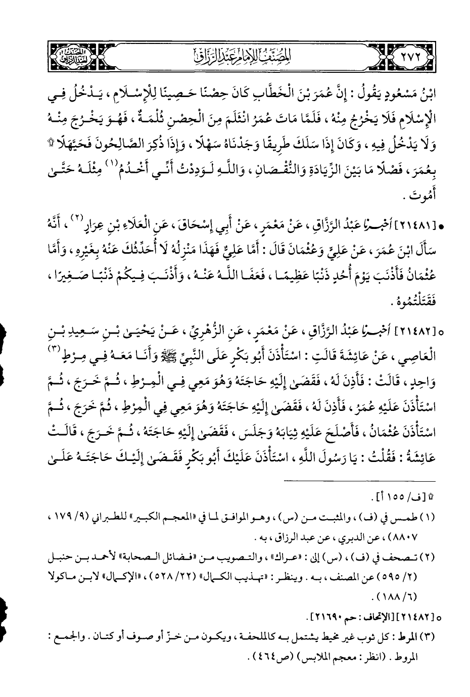 ° [٢١٤٨٢] أَخْبَرَنَا عَبْدُ الرَّزَّاقِ، عَنْ مَعْمَرٍ، عَنِ الزُّهْرِيِّ، عَنْ يَحْيَى بْنِ سَعِيدِ بْنِ الْعَاصِي، عَنْ عَائِشَةَ قَالَتِ: اسْتَأْذَنَ أَبُو بَكْرٍ عَلَى النَّبِيِّ - صلى الله عليه وسلم - وَأَنَا مَعَهُ فِي مرْطٍ (¬٣) وَاحِدٍ، قَالَتْ: فَأَذِنَ لَه، فَقَضَىى إِلَيْهِ حَاجَتَهُ وَهُوَ مَعِي فِي الْمِرْطِ، ثُمَّ خَرَجَ، ثُمَّ اسْتَأْذَنَ عَلَيْهِ عُمَر، فَأَذِنَ لَه، فَقَضَى إِلَيْهِ حَاجَتَهُ وَهُوَ مَعِي فِي الْمِرْطِ، ثُمَّ خَرَجَ، ثُمَّ اسْتَأْذَنَ عُثْمَان، فَأَصْلَحَ عَلَيْهِ ثِيَابَهُ وَجَلَسَ، فَقَضَى إِلَيْهِ حَاجَتَه، ثُمَّ خَرَجَ، قَالَتْ عَائِشَةُ: فَقُلْتُ: يَا رَسُولَ اللَّهِ، اسْتَأْذَنَ عَلَيْكَ أَبُو بَكْرٍ فَقَضَى إِلَيْكَ حَاجَتَهُ عَلَى