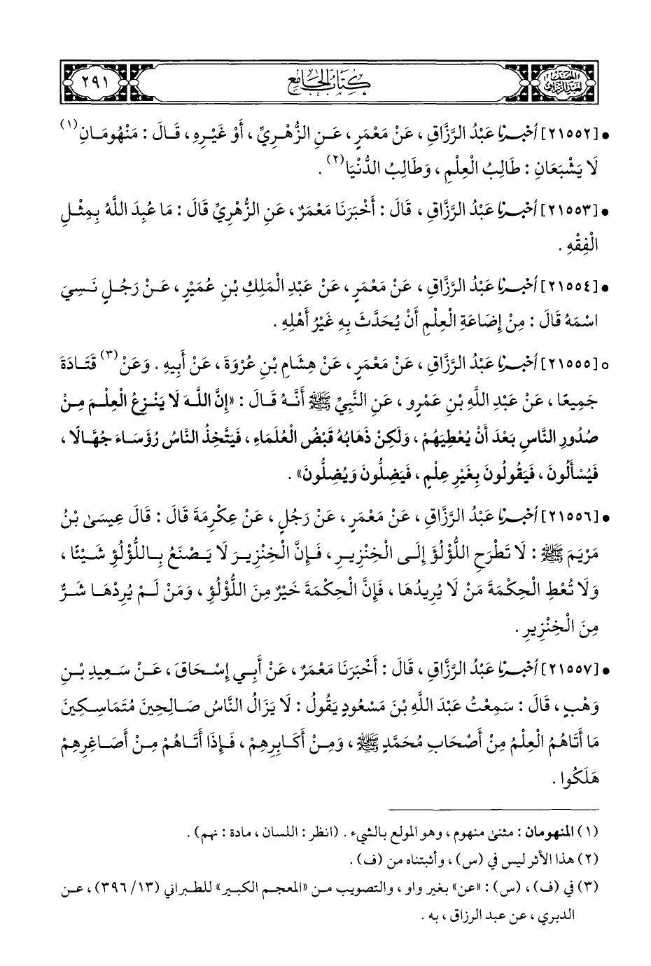 • [٢١٥٥٢] أَخْبَرَنَا عَبْدُ الرَّزَّاقِ، عَنْ مَعْمَرٍ، عَنِ الزُّهْرِيِّ، أَوْ غَيْرِهِ، قَالَ: مَنْهُومَانِ (¬١) لَا يَشْبَعَانِ: طَالِبُ الْعِلْمِ، وَطَالِبُ الدُّنْيَا (¬٢).