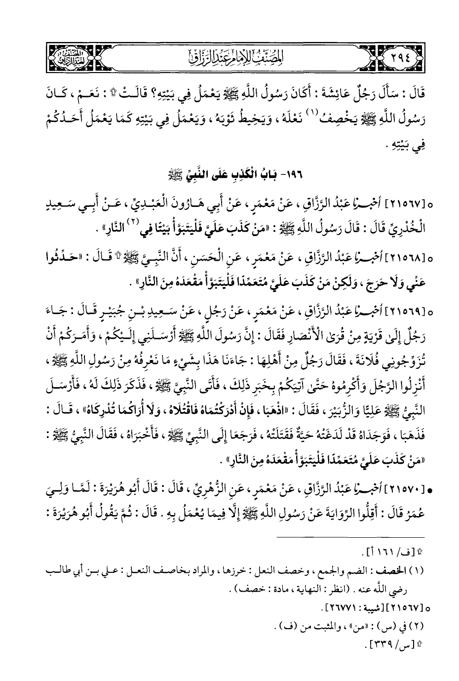 ° [٢١٥٦٨] أَخْبَرَنَا عَبْدُ الرَّزَّاقِ، عَنْ مَعْمَرٍ، عَنِ الْحَسَنِ، أَنَّ النَّبِيَّ - صلى الله عليه وسلم - * قَالَ: "حَدِّثُوا عَنِّي وَلَا حَرَجَ، وَلَكِنْ مَنْ كَذَبَ عَلَيَّ مُتَعَمِّدًا فَلْيَتَبَوَّأْ مَقْعَدَهُ مِنَ النَّارِ".