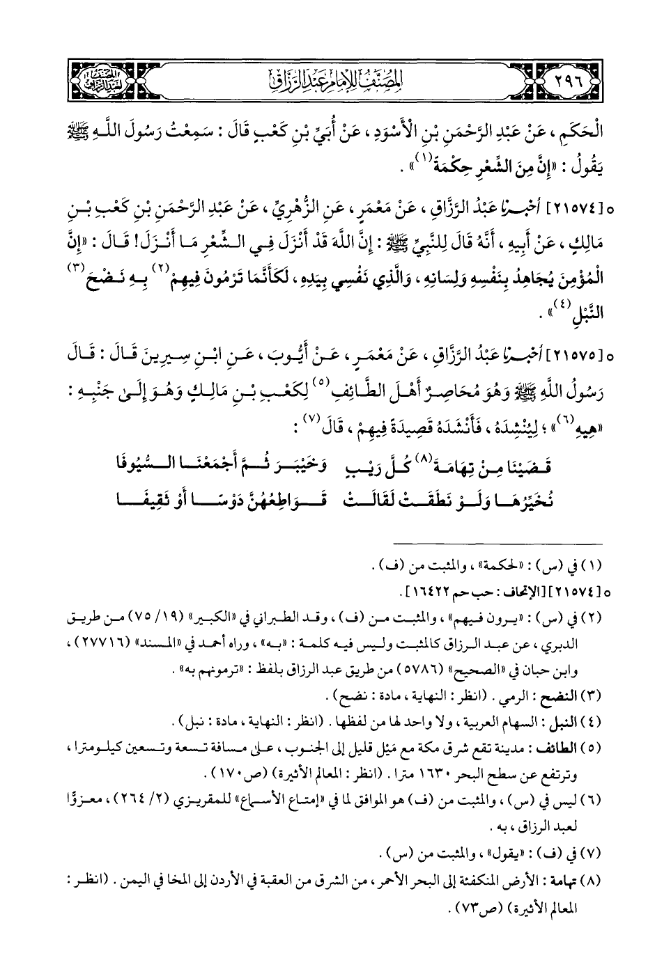 ° [٢١٥٧٥] أَخْبَرَنَا عَبْدُ الرَّزَّاقِ، عَنْ مَعْمَرٍ، عَنْ أَيُّوبَ، عَنِ ابْنِ سِيرِينَ قَالَ: قَالَ رَسُولُ اللَّهِ - صلى الله عليه وسلم -! وهُوَ مُحَاصِرٌ أَهْلَ الطَّائِفِ (¬٥) لِكَعْبِ بْنِ مَالِكٍ وَهُوَ إِلَى جَنْبِهِ: "هِيهِ (¬٦) "، لِيُنْشِدَه، فَأَنْشَدَهُ قَصِيدَةً فِيهِمْ، قَالَ (¬٧):