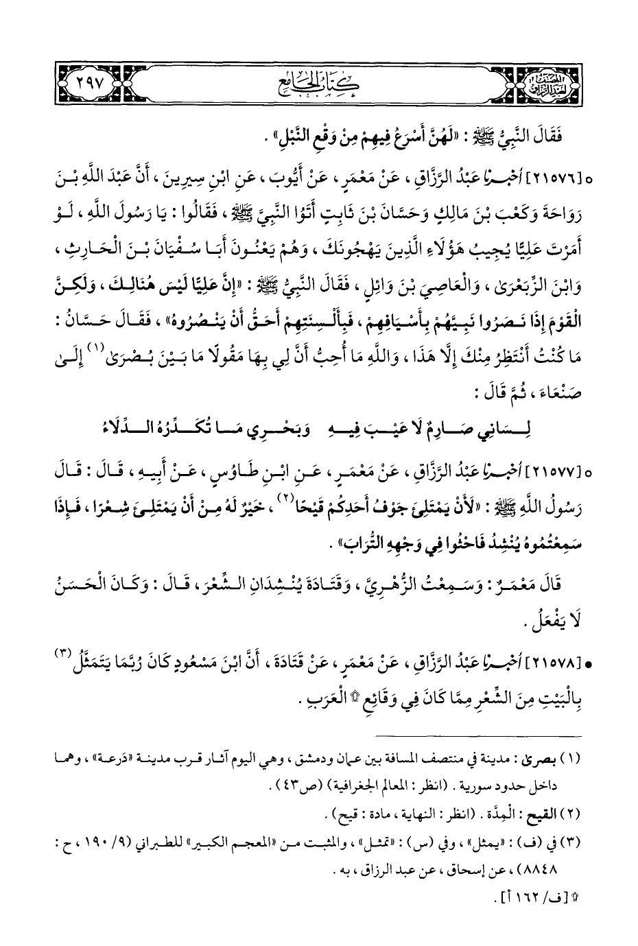 ° [٢١٥٧٦] أَخْبَرَنَا عَبْدُ الرَّزَّاقِ، عَنْ مَعْمَرٍ، عَنْ أَيُّوبَ، عَنِ ابْنِ سِيرِينَ، أَنَّ عَبْدَ اللَّهِ بْنَ رَوَاحَةَ وَكَعْبَ بْنَ مَالِكٍ وَحَسَّانَ بْنَ ثَابِتٍ أَتَوُا النَّبِيَّ - صلى الله عليه وسلم -، فَقَالُوا: يَا رَسُولَ اللَّهِ، لَوْ أَمَرْتَ عَلِيًّا يُجِيبُ هَؤُلَاءِ الَّذِينَ يَهْجُونَكَ، وَهُمْ يَعْنُونَ أَبَا سُفْيَانَ بْنَ الْحَارِثِ، وَابْنَ الزِّبَعْرَى، وَالْعَاصِيَ بْنَ وَائِلٍ، فَقَالَ النَّبِيُّ - صلى الله عليه وسلم -: "إِنَّ عَلِيًّا لَيْسَ هُنَالِكَ، وَلَكِن الْقَوْمَ إِذَا نَصَرُوا نَبِيَّهُمْ بِأَسْيَافِهِمْ، فَبِأَلْسِنَتِهِمْ أَحَقُّ أَنْ يَنْصُرُوهُ"، فَقَالَ حَسَّانُ: مَا كُنْتُ أَنْتَظِرُ مِنْكَ إِلَّا هَذَا، وَاللَّهِ مَا أُحِبُّ أَنَّ لِي بِهَا مَقُولًا مَا بَيْنَ بُصْرَى (¬١) إِلَى صَنْعَاءَ، ثُمَّ قَالَ: