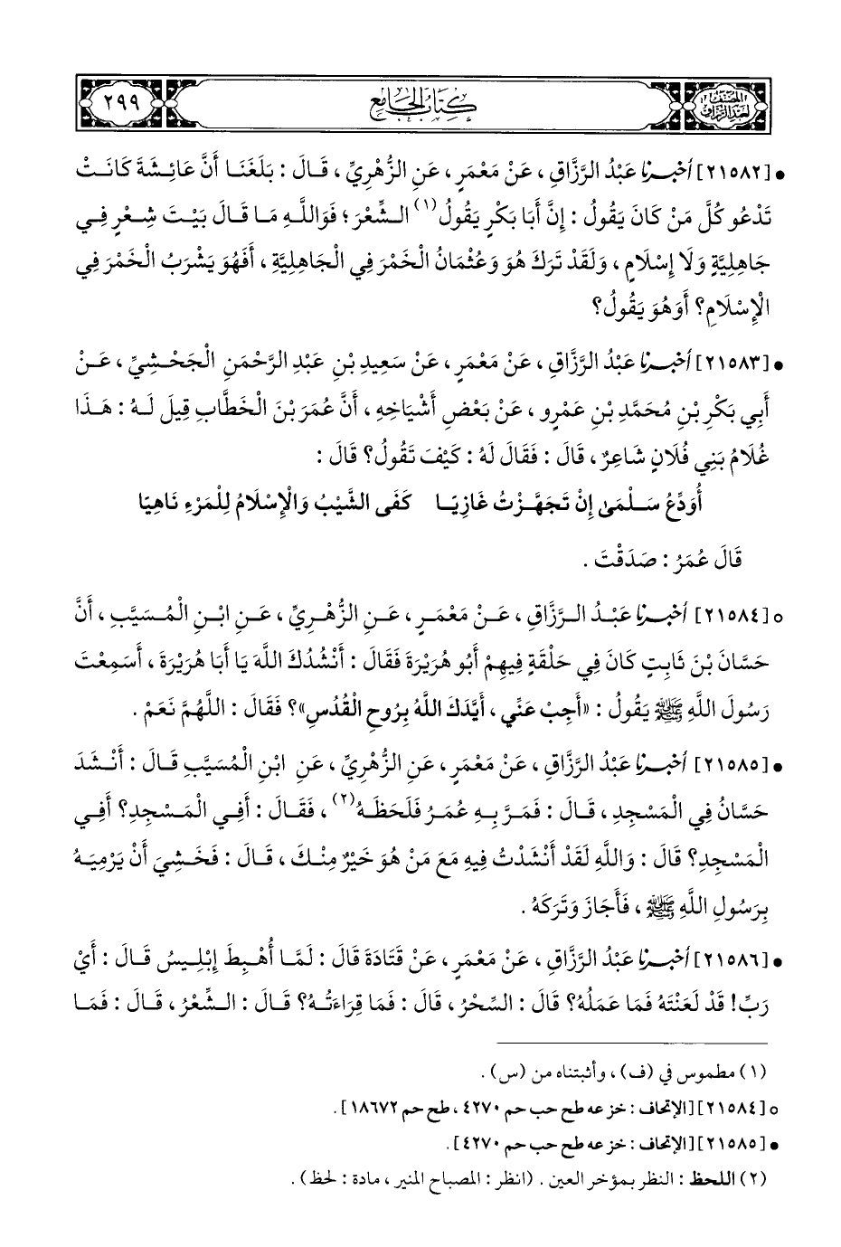 • [٢١٥٨٥] أَخْبَرَنَا عَبْدُ الرَّزَّاقِ، عَنْ مَعْمَرٍ، عَنِ الزُّهْرِيِّ، عَنِ ابْنِ الْمُسَيَّبِ قَالَ: أَنْشَدَ حَسَّانُ فِي الْمَسْجِدِ، قَالَ: فَمَرَّ بِهِ عُمَرُ فَلَحَظَهُ (¬٢)، فَقَالَ: أَفِي الْمَسْجِدِ؟ أَفِي الْمَسْجِدِ؟ قَالَ: وَاللَّهِ لَقَدْ أَنْشَدْتُ فِيهِ مَعَ مَنْ هُوَ خَيْرٌ مِنْكَ، قَالَ: فَخَشِيَ أَنْ يَرْمِيَهُ بِرَسُولِ اللَّهِ - صلى الله عليه وسلم -، فَأَجَازَ وَتَرَكَهُ.