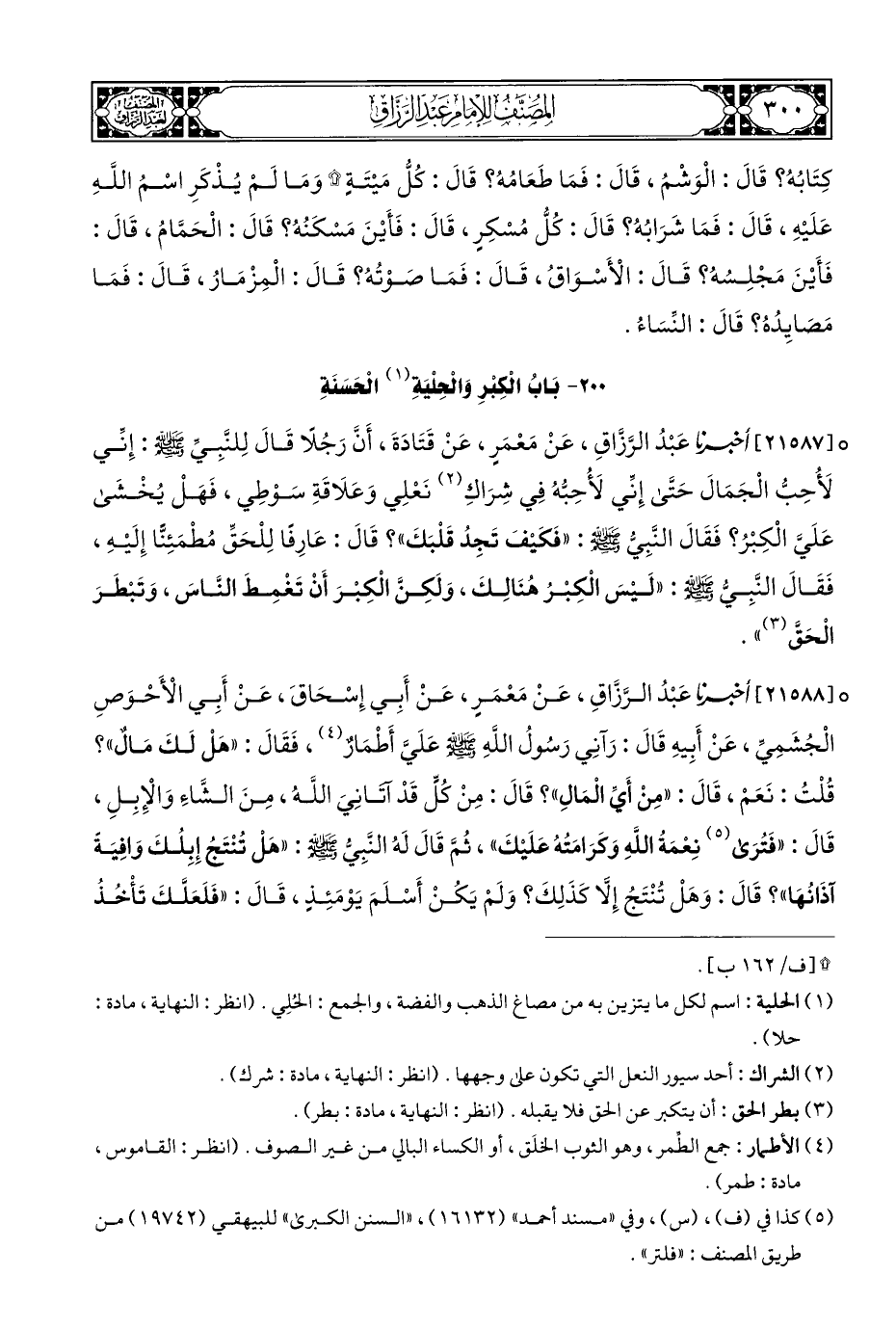 ° [٢١٥٨٧] أَخْبَرَنَا عَبْدُ الرَّزَّاقِ، عَنْ مَعْمَرٍ، عَنْ قَتَادَةَ، أَنَّ رَجُلًا قَالَ لِلنَّبِيِّ - صلى الله عليه وسلم -: إِنِّي لأُحِبُّ الْجَمَالَ حَتَّى إِنِّي لأُحِبُّهُ فِي شِرَاكِ (¬٢) نَعْلِي وَعَلَاقَةِ سَوْطِي، فَهَلْ يُخْشَى عَلَيَّ الْكِبْرُ؟ فَقَالَ النَّبِيُّ - صلى الله عليه وسلم -: "فَكَيْفَ تَجِدُ قَلْبَكَ"؟ قَالَ: عَارِفًا لِلْحَقِّ مُطْمَئِنًّا إِلَيْهِ، فَقَالَ النَّبِيُّ - صلى الله عليه وسلم -: "لَيْسَ الْكِبْرُ هُنَالِكَ، وَلَكِنَّ الْكِبْرَ أَنْ تَغْمِطَ النَّاسَ، وَتَبْطَرَ الْحَقَّ (¬٣) ".