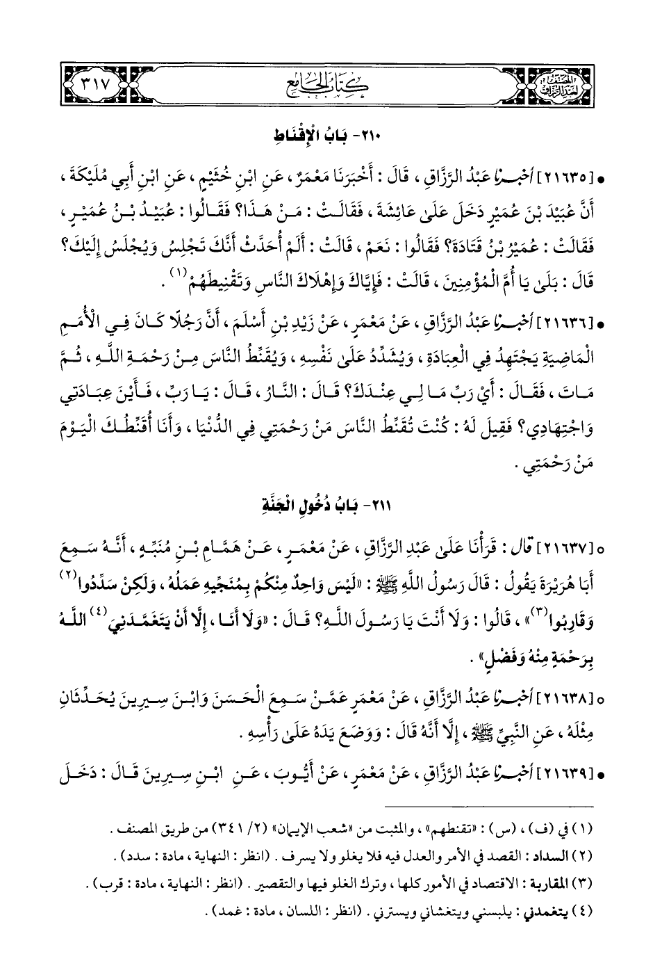 • [٢١٦٣٦] أخبرنا عَبْدُ الرَّزَّاقِ، عَنْ مَعْمَرٍ، عَنْ زَيْدِ بْنِ أَسْلَمَ، أَنَّ رَجُلًا كَانَ فِي الْأُمَمِ الْمَاضِيَةِ يَجْتَهِدُ فِي الْعِبَادَةِ، وَيُشَدِّدُ عَلَى نَفْسِهِ، وَيُقَنِّطُ النَّاسَ مِنْ رَحْمَةِ اللَّهِ، ثُمَّ مَاتَ، فَقَالَ: أَيْ رَبِّ مَا لِي عِنْدَكَ؟ قَالَ: النَّار، قَالَ: يَا رَبِّ، فَأَيْنَ عَبَادَتِي وَاجْتِهَادِي؟ فَقِيلَ لَهُ: كُنْتَ تُقَنِّطُ النَّاسَ مَنْ رَحْمَتِي فِي الدُّنْيَا، وَأَنَا أُقَنِّطُكَ الْيَوْمَ مَنْ رَحْمَتِي.