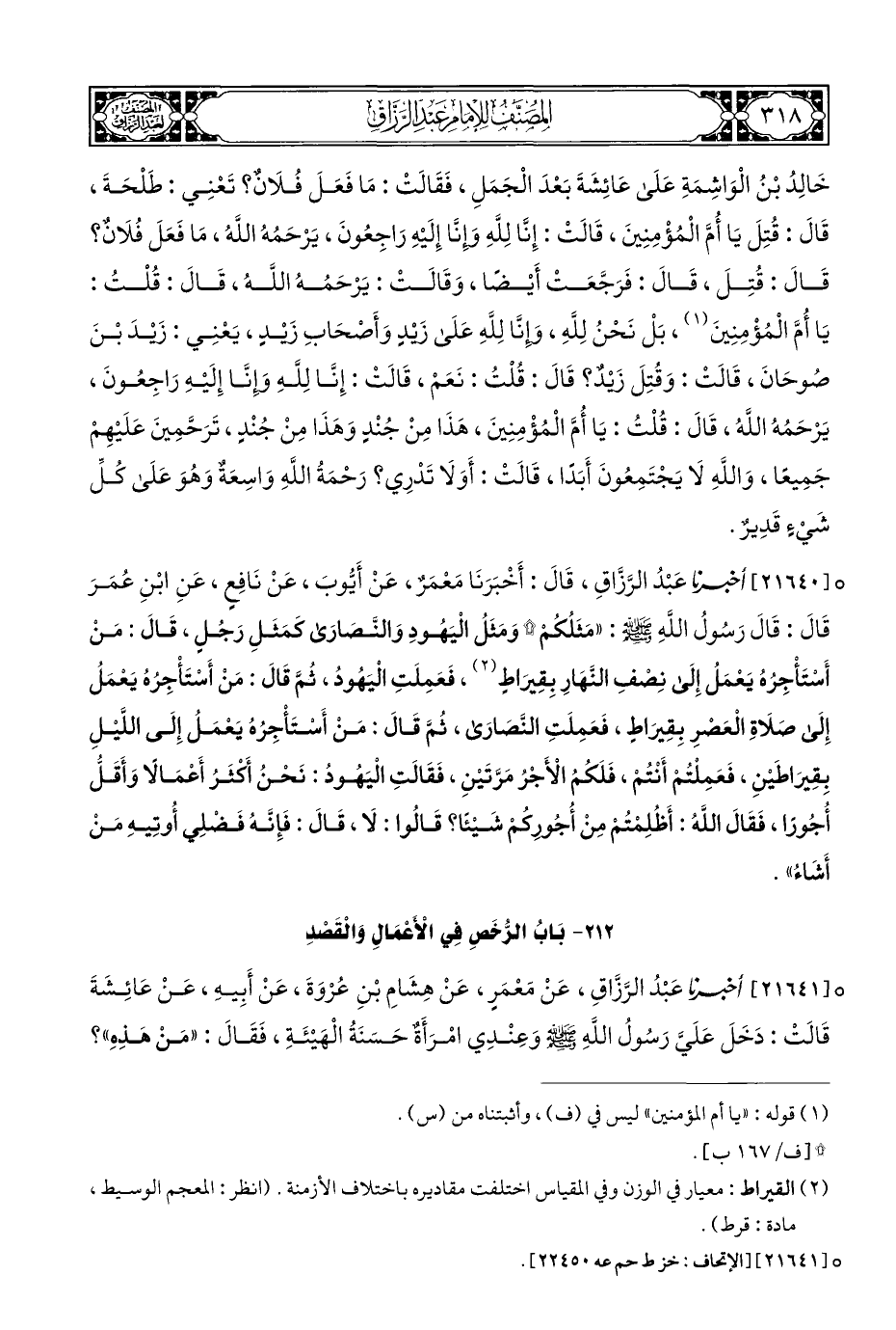 ° [٢١٦٤٠] أخبرنا عَبدُ الرَّزَّاقِ، قَالَ: أَخْبَرَنَا مَعْمَرٌ، عَن أَيُّوبَ، عَنْ نَافِعٍ، عَنِ ابْنِ عُمَرَ قَالَ: قَالَ رَسُولُ اللَّهِ - صلى الله عليه وسلم -: "مَثَلُكُم * وَمَثَلُ الْيَهُودِ وَالنَّصَارَى كَمَثَلِ رَجُلٍ، قَالَ: مَنْ أَستَأْجِرُهُ يَعْمَلُ إِلَى نِصْفِ النَّهَارِ بِقِيرَاطٍ (¬٢)، فَعَمِلَتِ الْيَهُود، ثُمَّ قَالَ: مَنْ أَسْتَأْجِرُهُ يَعْمَلُ إِلَى صَلَاةِ الْعَصْرِ بِقِيرَاطٍ، فَعَمِلَتِ النَّصَارَى، ثُمَّ قَالَ: مَن أَستَأْجِرُهُ يَعْمَلُ إِلَى اللَّيْلِ بِقِيرَاطَيْنِ، فَعَمِلتُمْ أَنْتُمْ، فَلَكُمُ الْأَجْرُ مَرَّتَيْنِ، فَقَالَتِ الْيَهُودُ: نَحْنُ أَكْثَرُ أَعْمَالًا وَأَقَلُّ أُجُورًا، فَقَالَ اللَّهُ: أَظُلِمْتُمْ مِنْ أُجُورِكُمْ شَيْئًا؟ قَالُوا: لَا، قَالَ: فَإِنَّهُ فَضْلِي أُوتِيهِ مَنْ أَشَاءُ".