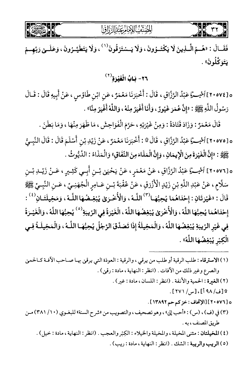 ° [٢٠٥٧٥] أخبرنا عَبْدُ الرَّزَّاقِ، قَالَ *: أَخْبَرَنَا مَعْمَرٌ، عَنْ زَيْدِ بْنِ أَسْلَمَ قَالَ: قَالَ النَّبِيُّ - صلى الله عليه وسلم -: "إِنَّ الْغَيْرَةَ مِنَ الْإِيمَانِ، وَإِنَّ الْمَذَاءَ مِنَ النِّفَاقِ" وَالْمَذَاءُ: الدَّيُّوثُ.