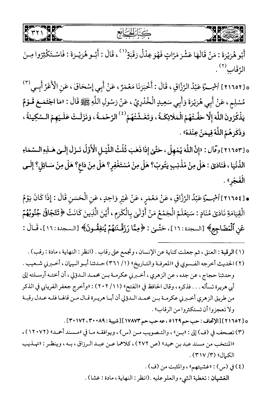 • [٢١٦٥٤] أخبرنا عَبْدُ الرَّزَّاقِ، عَنْ مَعْمَرٍ، عَنْ غَيْرِ وَاحِدٍ، عَنِ الْحَسَنِ قَالَ: إِذَا كَانَ يَوْمُ الْقِيَامَةِ نَادَى مُنَادٍ: سَيَعْلَمُ الْجَمْعُ مَنْ أَوْلَى بِالْكَرَمِ، أَيْنَ الذِينَ كَانَتْ {تَتَجَافَى جُنُوبُهُمْ عَنِ الْمَضَاجِعِ} [السجدة: ١٦]، حَتَّى: {وَمِمَّا رَزَقْنَاهُمْ يُنْفِقُونَ} [السجدة: ١٦]، قَالَ: