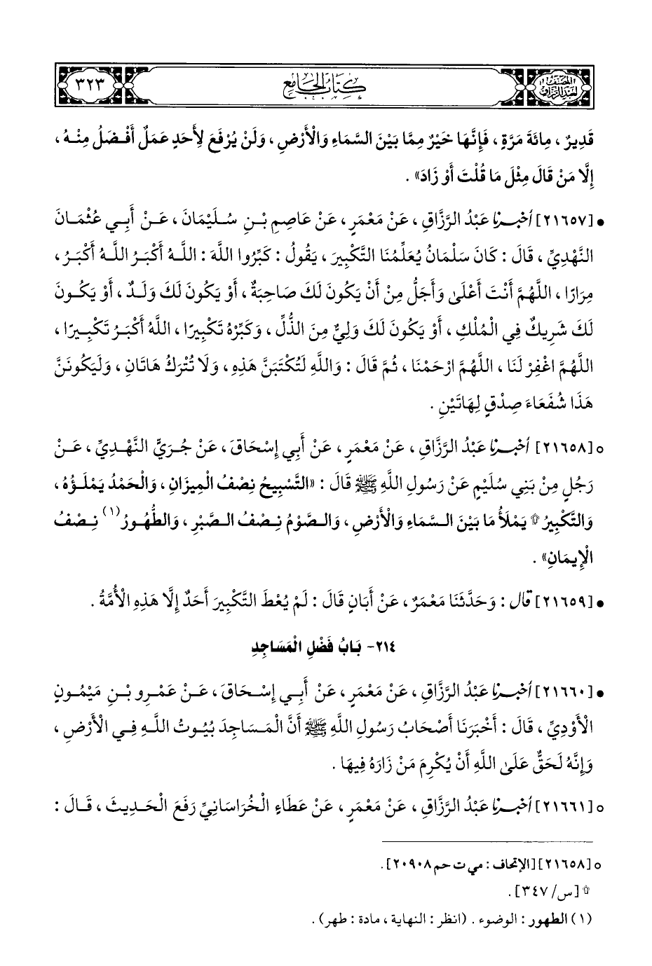 ° [٢١٦٥٨] أخبرنا عَبْدُ الرَّزَّاقِ، عَنْ مَعْمَرٍ، عَنْ أَبِي إِسْحَاقَ، عَنْ جُرَيِّ النَّهْدِيِّ، عَنْ رَجُلٍ مِنْ بَنِي سُلَيْمٍ عَنْ رَسُولِ اللَّهِ - صلى الله عليه وسلم - قَالَ: "التَّسْبِيحُ نِصْفُ الْمِيزَانِ، وَالحَمْدُ يَمْلَؤُه، وَالتكبِيرُ * يَمْلأُ مَا بَيْنَ السَّمَاءِ وَالْأَرْضِ، وَالصَّوْمُ نِصْفُ الصَّبْرِ، وَالطُّهُورُ (¬١) نِصْفُ الْإِيمَانِ".