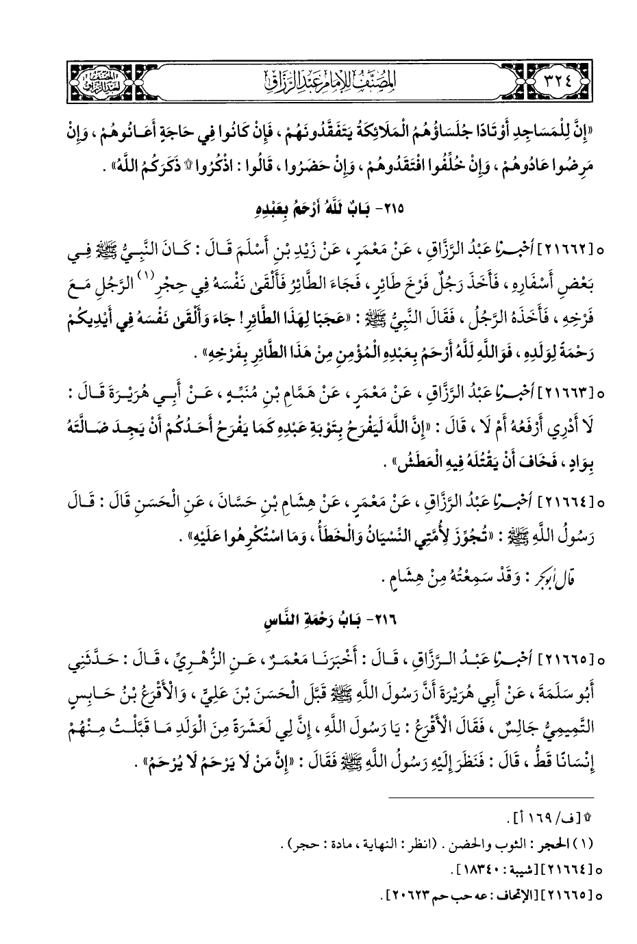 ° [٢١٦٦٢] أخبرنا عَبْدُ الرَّزَّاقِ، عَنْ مَعْمَرٍ، عَنْ زَيْدِ بْنِ أَسْلَمَ قَالَ: كَانَ النَّبِيُّ - صلى الله عليه وسلم - في بَعْضِ أَسْفَارِهِ، فَأَخَذَ رَجُلٌ فَرْخَ طَائِرٍ، فَجَاءَ الطَائِرُ فَأَلْقَى نَفْسَهُ فِي حِجْرِ (¬١) الرَّجُلِ مَعَ فَرخِهِ، فَأَخَذَهُ الرَّجُل، فَقَالَ النَّبِيُّ - صلى الله عليه وسلم -: "عَجَبًا لِهَذَا الطَّائِرِ! جَاءَ وَألقَى نَفْسَهُ فِي أَيْدِيكُمْ رَحْمَةً لِوَلَدِهِ، فَوَاللهِ لَلَّهُ أَرْحَمُ بِعَبْدِهِ الْمُؤْمِنِ مِنْ هَذَا الطَّائِرِ بِفَرْخِهِ".