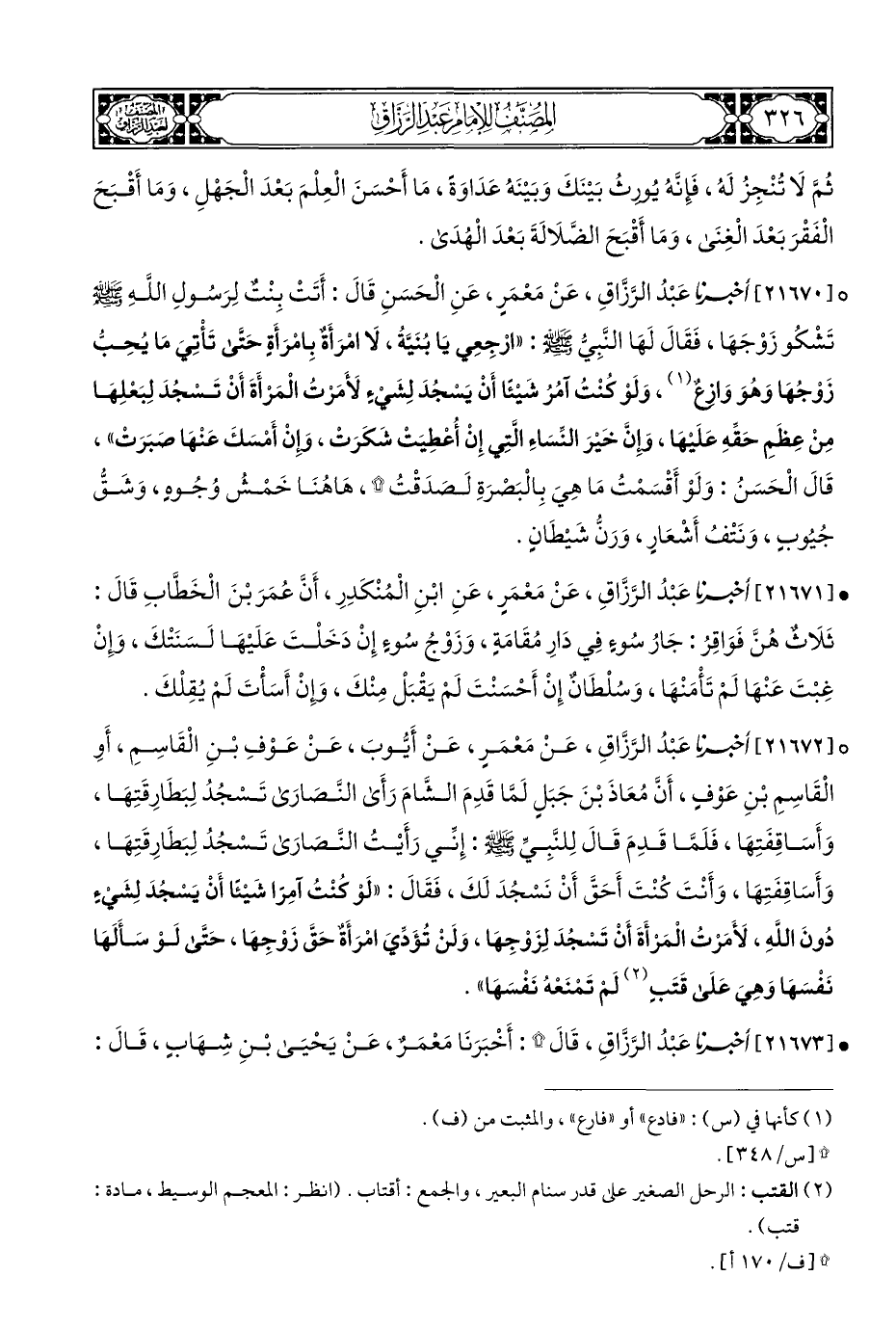 • [٢١٦٧٣] أخبرنا عَبْدُ الرَّزَّاقِ، قَالَ *: أَخْبَرَنَا مَعْمَرٌ، عَنْ يَحْيَى بْنِ شِهَابٍ، قَالَ: