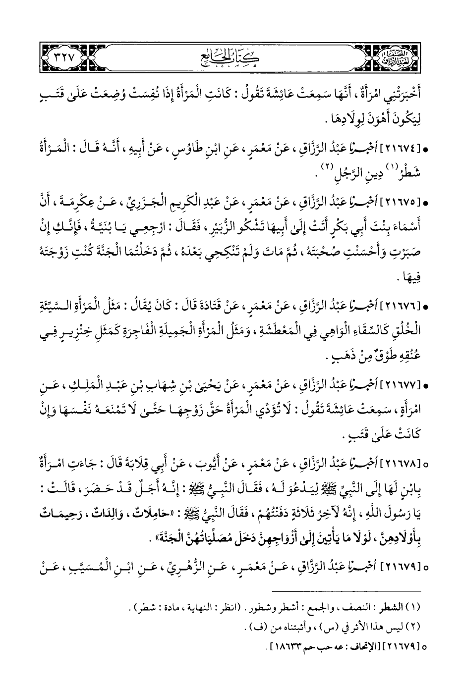 • [٢١٦٧٤] أخبرنا عَبْدُ الرَّزَّاقِ، عَنْ مَعْمَرٍ، عَنِ ابْنِ طَاوُسٍ، عَنْ أَبِيهِ، أَنَّهُ قَالَ: الْمَرْأَةُ شَطْرُ (¬١) دينِ الرَّجُلِ (¬٢).