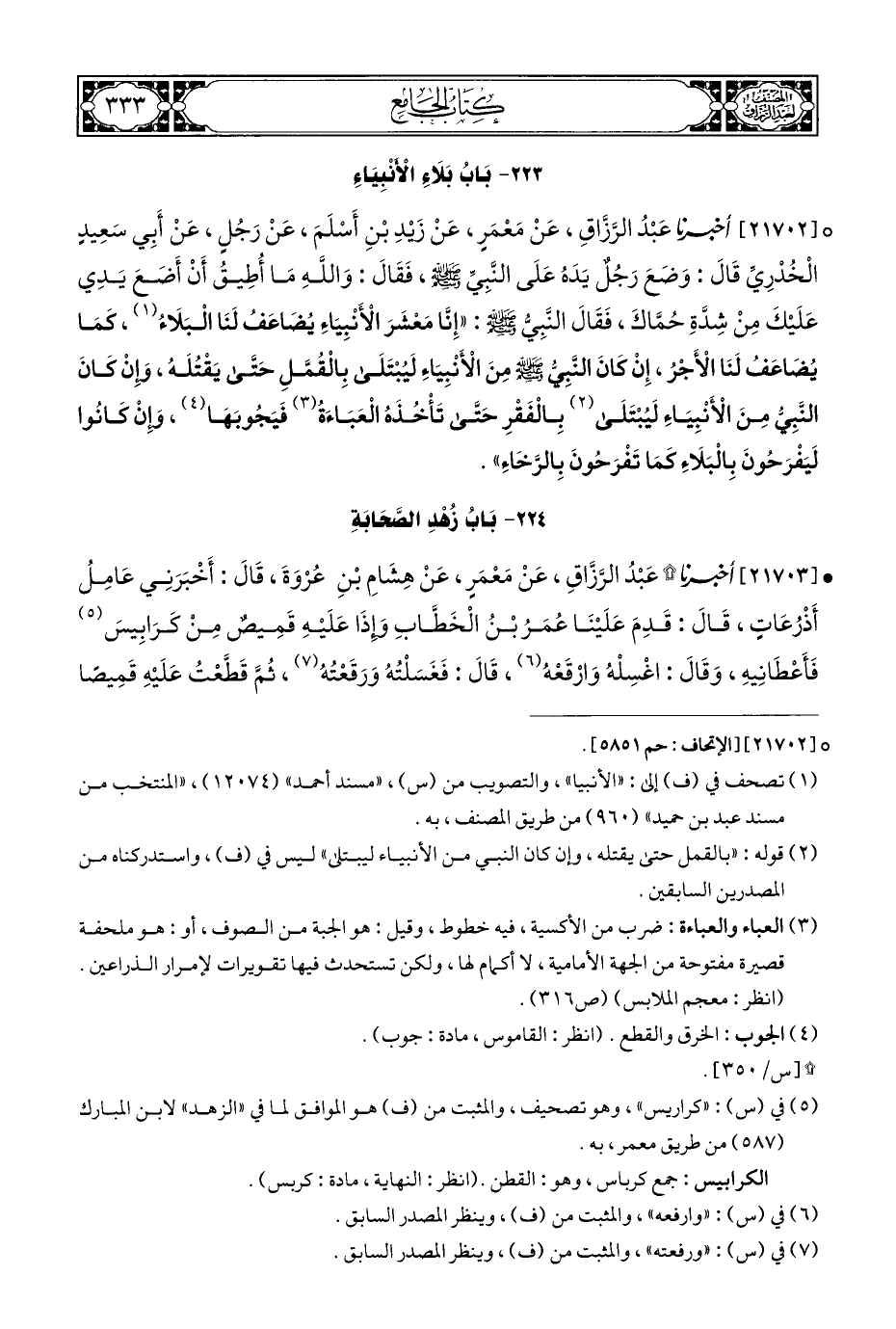 ° [٢١٧٠٢] أخبرنا عَبْدُ الرَّزَّاقِ، عَنْ مَعْمَرٍ، عَنْ زَيْدِ بْنِ أَسْلَمَ، عَنْ رَجُلٍ، عَنْ أَبِي سَعِيدٍ الْخُدْرِيِّ قَالَ: وَضَعَ رَجُلٌ يَدَهُ عَلَى النَّبِيِّ - صلى الله عليه وسلم -، فَقَالَ: وَاللهِ مَا أُطِيقُ أَنْ أَضَعَ يَدِي عَلَيْكَ مِنْ شِدَّةِ حُمَّاكَ، فَقَالَ النَّبِيُّ - صلى الله عليه وسلم -: "إِنا مَعْشَرَ الْأَنْبِيَاءِ يُضَاعَفُ لَنَا الْبَلَاءُ (¬١)، كمَا يُضَاعَفُ لَنَا الْأَجْر، إِنْ كَانَ النَّبِيُّ - صلى الله عليه وسلم - مِنَ الْأَنْبِيَاءِ لَيُبْتَلَى بِالْقُمَّلِ حَتى يَقْتُلَه، وإنْ كَانَ النَّبِيُّ مِنَ الْأَنْبِيَاءِ لَيُبْتَلَى (¬٢) بِالْفَقْرِ حَتَّى تَأْخُذَهُ الْعَبَاءَةُ (¬٣) فَيَجُوبَهَا (¬٤)، وَإِنْ كَانُوا لَيَفْرَحُونَ بِالْبَلَاءِ كَمَا تَفْرَحُونَ بِالرَّخَاءِ".