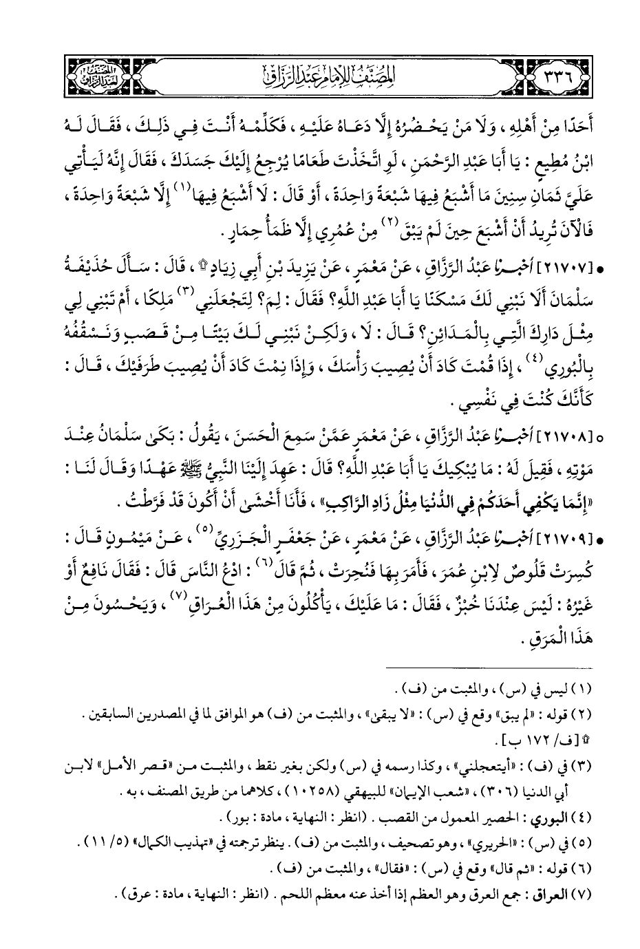 ° [٢١٧٠٨] أخبرنا عَبْدُ الرَّزَّاقِ، عَنْ مَعمَرٍ عَمَّنْ سَمِعَ الْحَسَنَ، يَقُولُ: بَكَى سَلْمَانُ عِنْدَ مَوْتِهِ، فَقِيلَ لَهُ: مَا يُبْكِيكَ يَا أَبَا عَبْدِ اللَّهِ؟ قَالَ: عَهِدَ إِلَيْنَا النَّبِيُّ - صلى الله عليه وسلم - عهْدًا وَقَالَ لَنَا: "إِنَّمَا يَكْفِي أَحَدَكُمْ فِي الدُّنْيَا مِثلُ زَادِ الرَّاكِبِ"، فَأَنَا أَخْشَى أَنْ أكُونَ قَدْ فَرَّطْتُ.