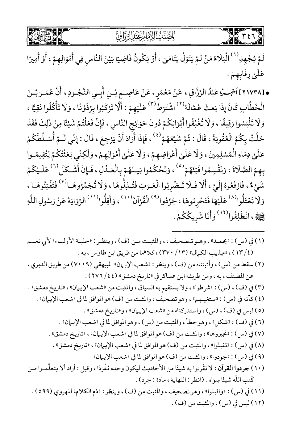 • [٢١٧٣٨] أخبرنا عَبْدُ الرَّزاقِ، عَنْ مَعْمَرٍ، عَنْ عَاصِمِ بْنِ أَبِي النَّجُودِ، أَنَّ عُمَرَ بْنَ الْخَطَّابِ كَانَ إِذَا بَعَثَ عُمَّالَهُ (¬٢) اشْتَرَطَ (¬٣) عَلَيْهِمْ: أَلَّا تَركَبُوا بِرذَوْنًا، وَلَا تَأْكُلُوا نَقِيًّا، وَلَا تَلْبَسُوا رَقِيقًا، وَلَا تُغْلِقُوا أَبْوَابَكُمْ دُونَ حَوَائِجِ النَّاسِ، فَإِنْ فَعَلْتُمْ شَيْئًا مِنْ ذَلِكَ فَقَدْ حَلَّت بِكُمُ الْعُقُوبَة، قَالَ: ثُمَّ شَيَّعَهُمْ (¬٤)، فَإِذَا أَرَادَ أَنْ يَرجِعَ، قَالَ: إِني لَمْ أُسَلِّطْكُمْ عَلَى دِمَاءِ الْمُسْلِمِينَ، وَلَا عَلَى أَعْرَاضِهِمْ، وَلَا عَلَى أَمْوَالِهِمْ، وَلكِنِّي بَعَثْتُكُمْ لِتُقِيمُوا بِهِمُ الصُّلَاةَ، وتَقْسِمُوا فَيْئَهُمْ (¬٥)، وَتَحْكُمُوا بَيْنَهُمْ بِالْعَدْلِ، فَإِنْ أَشْكَلَ (¬٦) عَلَيْكُمْ شَيءٌ، فَارْفَعُوهُ إِلَيَّ، أَلَا فَلَا تَضْرِبُوا الْعَرَبَ فَتُذِلُّوهَا، وَلَا تُجَمِّرُوهَا (¬٧) فَتَفْتِنُوهَا، وَلَا تَعْتَلُّوا (¬٨) عَلَيْهَا فَتَحْرِمُوهَا، جَرِّدُوا (¬٩) الْقُرْآنَ (¬١٠)، وَأَقِلُّوا (¬١١) الرِّوَايَةَ عَنْ رَسُولِ اللهِ - صلى الله عليه وسلم -، انْطَلِقُوا (¬١٢) وَأَنَا شَرِيكُكُمْ.