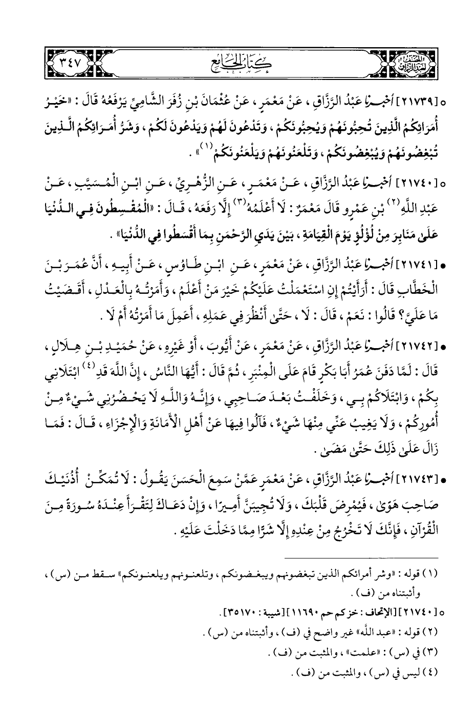 ° [٢١٧٣٩] أخبرنا عَبْدُ الرَّزاقِ، عَنْ مَعْمَرٍ، عَنْ عُثْمَانَ بْنِ زُفَرَ الشَّامِيِّ يَرْفَعُهُ قَالَ: "خَيْرُ أُمَرَائِكُمُ الَّذِينَ تُحِبُّونَهُمْ وَيُحِبُّونَكُمْ، وَتَدْعُونَ لَهُمْ وَيَدْعُونَ لَكُمْ، وَشَرُّ أُمَرَائِكُمُ الَّذِينَ تُبْغِضُونَهُمْ وَيُبْغِضُونَكُمْ، وَتَلْعَنُونَهُمْ وَيَلْعَنُونَكُمْ (¬١) ".