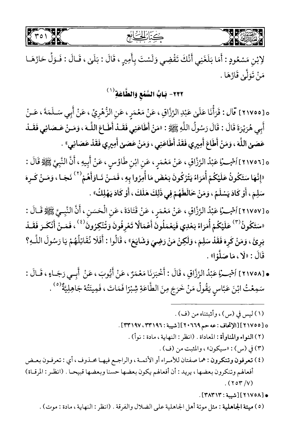 ° [٢١٧٥٥] قال: قَرَأْنَا عَلَى عَبْدِ الرَّزَّاقِ، عَنْ مَعْمَر، عَنِ الزُّهْرِيِّ، عَنْ أَبِي سَلَمَةَ، عَنْ أَبِي هُرَيْرة قَالَ: قَالَ رَسُولُ اللَّهِ - صلى الله عليه وسلم -: "مَنْ أَطَاعَنِي فَقَدْ أَطَاعَ اللَّهَ، وَمَنْ عَصَانِي فَقَدْ عَصَى اللَّهَ، وَمَنْ أَطَاعَ أَمِيرِي فَقَدْ أَطَاعَنِي، وَمَنْ عَصَى أَمِيرِي فَقَدْ عَصَانِي".