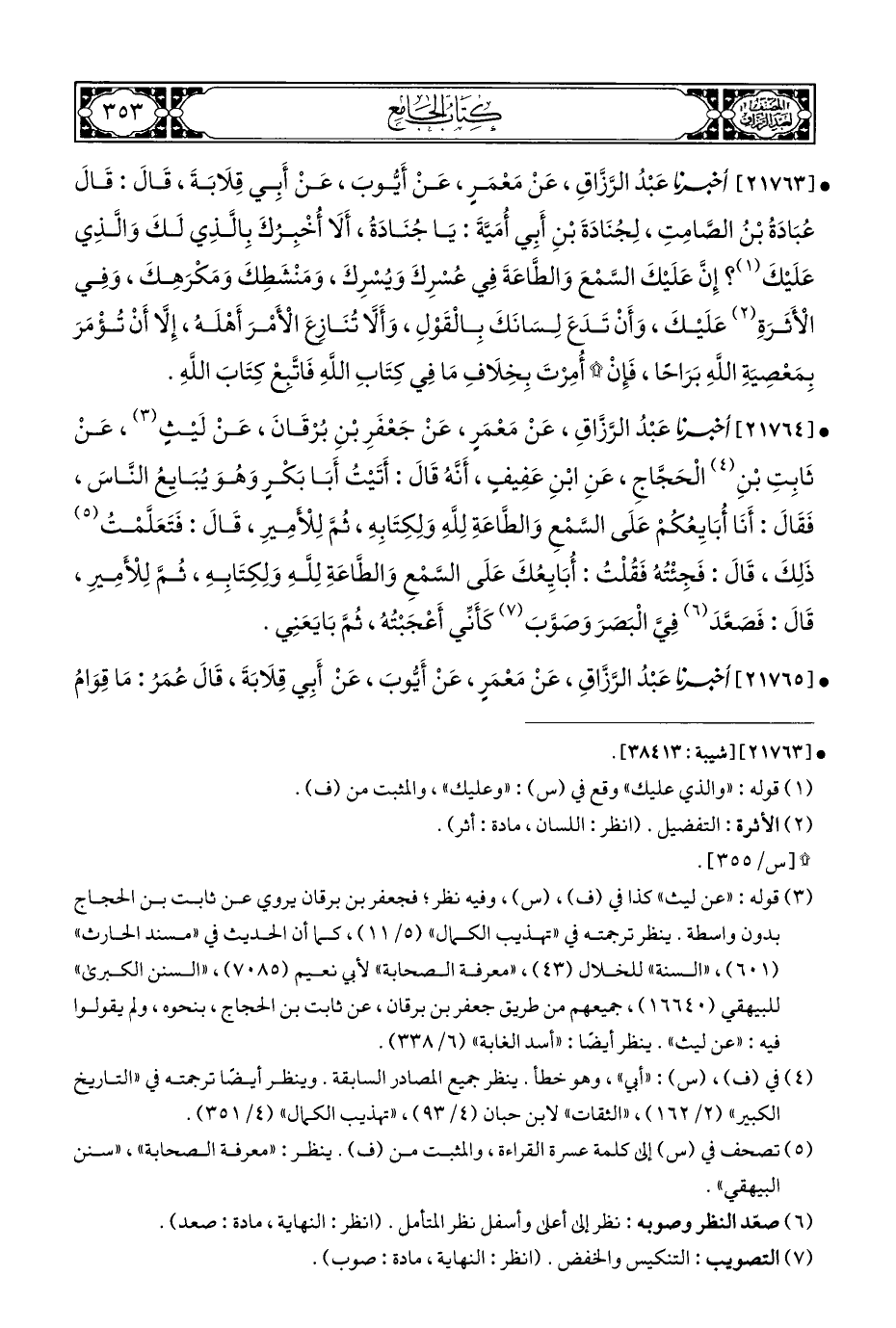 • [٢١٧٦٣] أخبرنا عَبْدُ الرَّزاقِ، عَنْ مَعْمَر، عَنْ أَيُّوبَ، عَنْ أَبِي قِلَابَةَ، قَالَ: قَالَ عُبَادَةُ بْنُ الصَّامِتِ، لِجُنَادَةَ بْنِ أَبِي أُمَيَّةَ: يَا جُنَادَة، أَلَا أُخْبِرُكَ بِالَّذِي لَكَ وَالَّذِي عَلَيْكَ (¬١)؟ إِنَّ عَلَيْكَ السَّمْعَ وَالطَّاعَةَ فِي عُسْرِكَ وَيُسْرِكَ، وَمَنْشَطِكَ وَمَكْرَهِكَ، وَفِي الْأَثَرةِ (¬٢) عَلَيْكَ، وَأَنْ تَدَعَ لِسَانَكَ بِالْقَوْلِ، وَأَلَّا تُنَازِعَ الْأَمْرَ أَهْلَه، إِلَّا أَنْ تُؤْمَرَ بِمَعْصِيَةِ اللَّهِ بَرَاحًا، فَإِنْ * أُمِرْتَ بِخِلَافِ مَا فِي كِتَابِ اللَّهِ فَاتَّبعْ كِتَابَ اللهِ.
