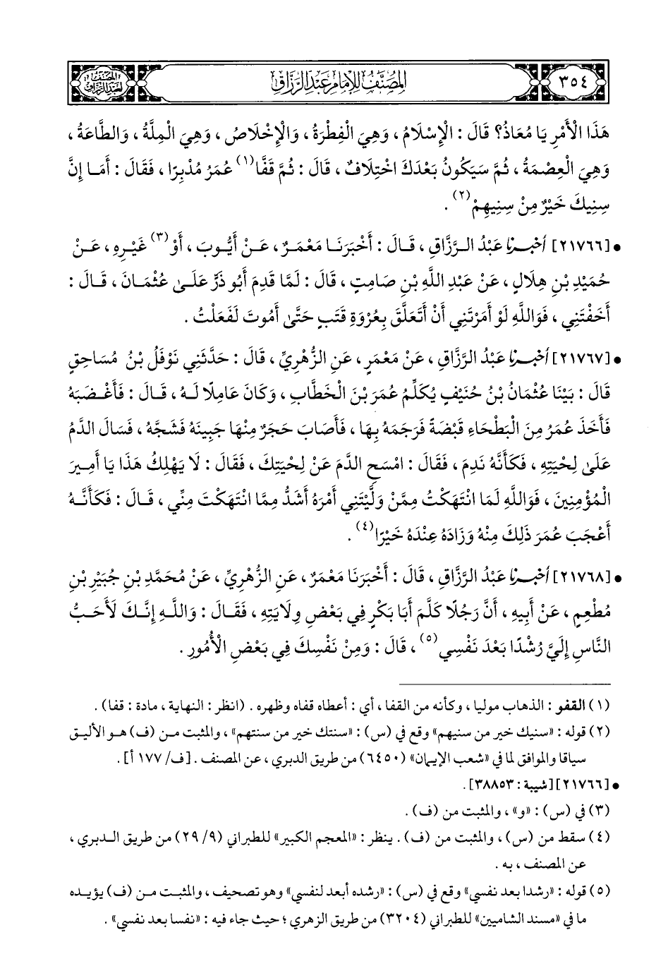• [٢١٧٦٧] أخبرنا عَبْدُ الرَّزَّاقِ، عَنْ مَعْمَرٍ، عَنِ الزُّهْرِيِّ، قَالَ: حَدَّثَنِي نَوْفَلُ بْنُ مُسَاحِقٍ قَالَ: بَيْنَا عُثْمَانُ بْن حُنَيْفٍ يُكَلِّمُ عُمَرَ بْنَ الْخَطَّابِ، وَكَانَ عَامِلًا لَه، قَالَ: فَأَغْضَبَهُ فَأَخَذَ عُمَرُ مِنَ الْبَطْحَاءِ قَبْضَةً فَرَجَمَهُ بِهَا، فَأَصَابَ حَجَرٌ مِنْهَا جَبِينَهُ فَشَجَّه، فَسَالَ الدَّمُ عَلَى لِحْيَتِهِ، فَكَأَنَّهُ نَدِمَ، فَقَالَ: امْسَحِ الدَّمَ عَنْ لِحْيَتِكَ، فَقَالَ: لَا يَهْلِكُ هَذَا يَا أَمِيرَ الْمُؤْمِنِينَ، فَوَاللَّهِ لَمَا انْتَهَكْتُ مِمَّنْ وَلَّيْتَنِي أَمْرَهُ أَشَدُّ مِمَّا انْتَهَكْتَ مِنِّي، قَالَ: فَكَأَنَّهُ أَعْجَبَ عُمَرَ ذَلِكَ مِنْهُ وَزَادَهُ عِنْدَهُ خَيْرًا (¬٤).