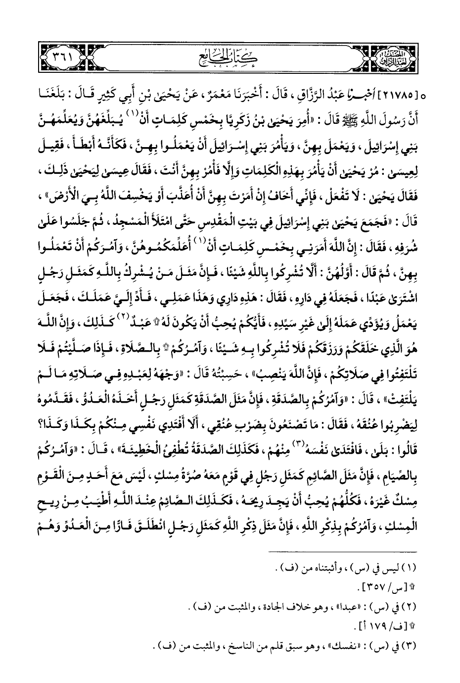 ° [٢١٧٨٥] أخبرنا عَبْدُ الرَّزَّاقِ، قَالَ: أَخْبَرَنَا مَعْمَرٌ، عَنْ يَحْيَى بْنِ أَبِي كَثِيرٍ قَالَ: بَلَغَنَا أَنَّ رَسُولَ اللَّهِ - صلى الله عليه وسلم - قالَ: "أُمِرَ يَحْيَى بْنُ زَكَرِيَّا بِخَمْسِ كَلِمَاتٍ أَنْ (¬١) يُبَلِّغَهُن وَيُعَلِّمَهُنَّ بَنِي إِسْرَائيلَ، وَيَعْمَلَ بِهِنَّ، وَيَأْمُرَ بَنِي إِسْرَائيلَ أَنْ يَعْمَلُوا بِهِنَّ، فَكَأَنَّهُ أَبْطَأَ، فَقِيلَ لِعِيسَى: مُرْ يَحْيَى أَنْ يَأْمُرَ بِهَذِهِ الْكَلِمَاتِ وَإلَّا فَأْمُر بِهِنَّ أَنْتَ، فَقَالَ عِيسَى لِيَحْيَى ذَلِكَ، فَقَالَ يَحْيَى: لَا تَفْعَلْ، فَإِنِّي أَخَافُ إِنْ أَمَرتَ بِهِنَّ أَنْ أُعَذَّبَ أَوْ يَخْسِفَ اللَّهُ ثُمَّ الْأَرْضَ"، قَالَ: "فَجَمَعَ يَحْيَى بَنِي إِسْرَائيل فِي بَيْتِ الْمَقْدِسِ حَتَّى امْتَلأَ الْمَسْجِد، ثُمَّ جَلَسُوا عَلَى شُرَفِهِ، فَقَالَ: إِنَّ اللهَ أَمَرَنِي بِخَمْسِ كَلِمَاتٍ أَنْ (¬١) أُعَلِّمَكُمُوهُنَّ، وَآمُرَكُمْ أَنْ تَعْمَلُوا بِهِنَّ، ثُمَّ قَالَ: أَوَّلُهُنَّ: ألَّا تُشْرِكُوا بِاللَّهِ شَيْئًا، فَإِن مَثَلَ مَنْ يُشْرِكُ بِاللَّهِ كَمَثَلِ رَجُلٍ اشْتَرَى عَبْدًا، فَجَعَلَهُ فِي دَارِهِ، فَقَالَ: هَذِهِ دَارِي وَهَذَا عَمَلِي، فَأَدِّ إِلَيَّ عَمَلَكَ، فَجَعَلَ يَعْمَلُ وَيُؤَدِّي عَمَلَهُ إِلَى غَيْرِ سَيِّدِهِ، فَأَيُّكُمْ يُحِبُّ أَنْ يَكُونَ لَهُ * عَبْدٌ (¬٢) كَذَلِكَ، وإنَّ اللَّهَ هُوَ الَّذِي خَلَقَكُمْ وَرَزَقَكُمْ فَلَا تُشْرِكوا بِهِ شَيْئًا، وَآمُرُكُمْ * بِالصَّلَاةِ، فَإِذَا صَلَّيْتُمْ فَلَا تَلْتَفِتُوا فِي صَلَاتِكُم، فَإِنَّ اللَّهَ يَنْصِبُ"، حَسِبْتُهُ قَالَ: "وَجْهَهُ لِعَبْدِهِ فِي صَلَاتِهِ مَا لَمْ يَلْتَفِتْ"، قَالَ: "وَآمُرُكُمْ بِالصَّدَقَةِ، فَإِنَّ مَثَلَ الصَّدَقَةِ كَمَثَلِ رَجُلٍ أَخَذَهُ الْعَدُوُّ، فَقَدَّمُوهُ لِيضَربُوا عُنُقَه، فَقَالَ: مَا تَصْنَعُونَ بِضَربِ عُنُقِي، أَلَا أَفْتَدِي نَفْسِي مِنْكُمْ بِكَذَا وَكَذَا؟ قَالُوا: بَلَى، فَافْتَدَى نَفْسَهُ (¬٣) مِنْهُمْ، فَكَذَلِكَ الصَّدَقَةُ تُطْفِئُ الْخَطِيئَةَ"، قَالَ: "وَآمُرُكُمْ بِالصِّيَامِ، فَإِنَّ مَثَلَ الصَّائِمِ كَمَثَلِ رَجُلٍ فِي قَوْمٍ مَعَهُ صُرَّةُ مِسْكٍ، لَيس مَعَ أَحَدٍ مِنَ الْقَوْمِ مِسْكٌ غَيْرَه، فَكُلُّهُمْ يُحِبُّ أَنْ يَجِدَ رِيحَه، فَكَذَلِكَ الصَّائِمُ عِنْدَ اللهِ أَطْيَبُ مِنْ رِيحِ الْمِسْكِ، وَآمُرُكُمْ بِذِكْرِ اللهِ، فَإِنَّ مَثَلَ ذِكْرِ اللَّهِ كَمَثَلِ رَجُلٍ انْطَلَقَ فَارًّا مِنَ الْعَدُوِّ وَهُمْ