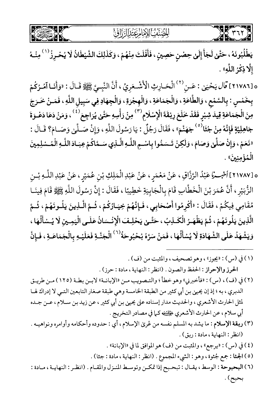 ° [٢١٧٨٦] قال يَحْيَى: عَنِ (¬٢) الْحَارِثِ الْأَشْعَرِيِّ، أَن النَّبِيَّ - صلى الله عليه وسلم - قَالَ: "وَأَنَا آمُرُكُم بِخَمْسٍ: بِالسَّمْعِ، وَالطَّاعَةِ، وَالْجَمَاعَةِ، وَالْهِجْرَةِ، وَالْجِهَادِ فِي سَبِيلِ اللهِ، فَمَنْ خَرَجَ مِنَ الْجَمَاعَةِ قِيدَ شِبرٍ فَقَدْ خَلَعَ رِبْقَةَ الْإِسْلَامِ (¬٣) مِنْ رَأْسِهِ حَتَّى يُرَاجِعَ (¬٤)، وَمَنْ دَعَا دَعْوَةَ جَاهِلِيَّةٍ فَإِنَّهُ مِنْ جُثَا (¬٥) جَهَنَّمَ"، فَقَالَ رَجُلٌ: يَا رَسُولَ اللهِ، وإنْ صَلَّى وَصَامَ؟ قَالَ: "نَعَم، وإنْ صَلَّى وَصَامَ، وَلَكِن تَسَمُّوا بِاسْمِ اللَّهِ الَّذِي سَمَّاكُمْ عِبَادَ اللَّهِ الْمُسْلِمِينَ الْمُؤمِنِينَ".