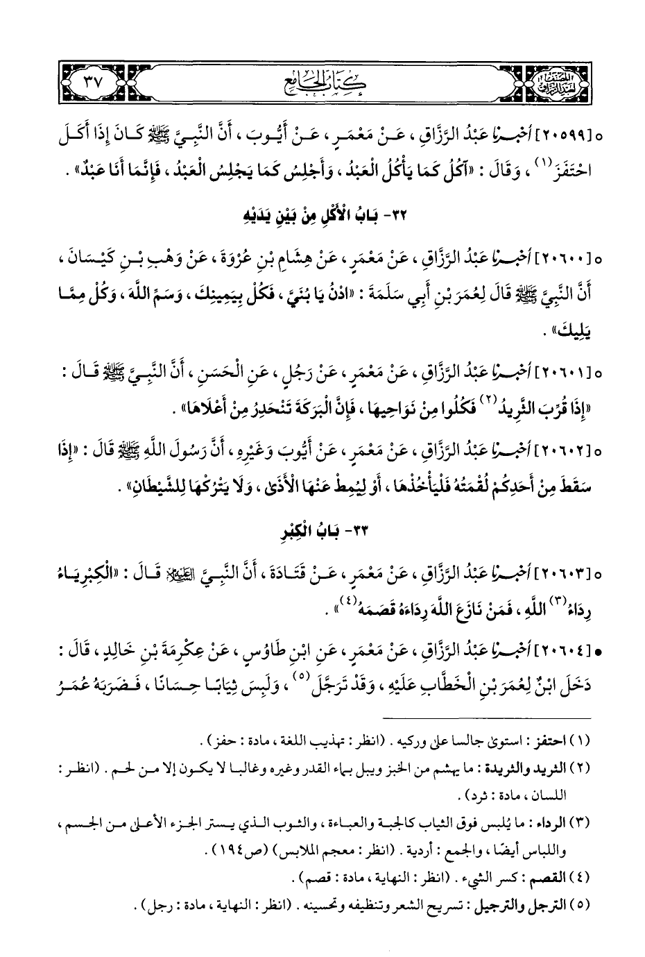 ° [٢٠٥٩٩] أخبرنا عَبْدُ الرَّزَّاقِ، عَنْ مَعْمَرٍ، عَنْ أَيُّوبَ، أَنَّ النبِيَّ - صلى الله عليه وسلم - كَانَ إِذَا أَكَلَ احْتَفَزَ (¬١)، وَقَالَ: "آكُلُ كَمَا يَأْكُلُ الْعَبْد، وَأَجْلِسُ كَمَا يَجْلِسُ الْعَبْد، فَإِنَّمَا أَنَا عَبْدٌ".