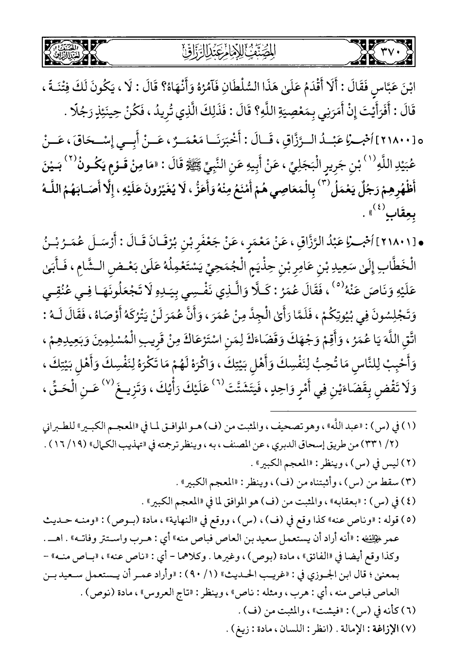 ° [٢١٨٠٠] أخبرنا عَبْدُ الرَّزَّاقِ، قَالَ: أَخْبَرَنَا مَعْمَرٌ، عَنْ أَبِي إِسْحَاقَ، عَنْ عُبَيْدِ اللهِ (¬١) بْنِ جَرِيرٍ الْبَجَلِيِّ، عَنْ أَبِيهِ عَنِ النَّبِيِّ - صلى الله عليه وسلم - قالَ: "مَا مِنْ قَوْم يَكُونُ (¬٢) بَيْنَ أَظْهُرِهِمْ رَجُلٌ يَعْمَلُ (¬٣) بِالْمَعَاصِي هُمْ أَمْنَعُ مِنْهُ وَأَعَزُّ، لَا يُغَيِّرُونَ عَلَيْهِ، إِلَّا أَصَابَهُمُ اللهُ بِعِقَابٍ (¬٤) ".