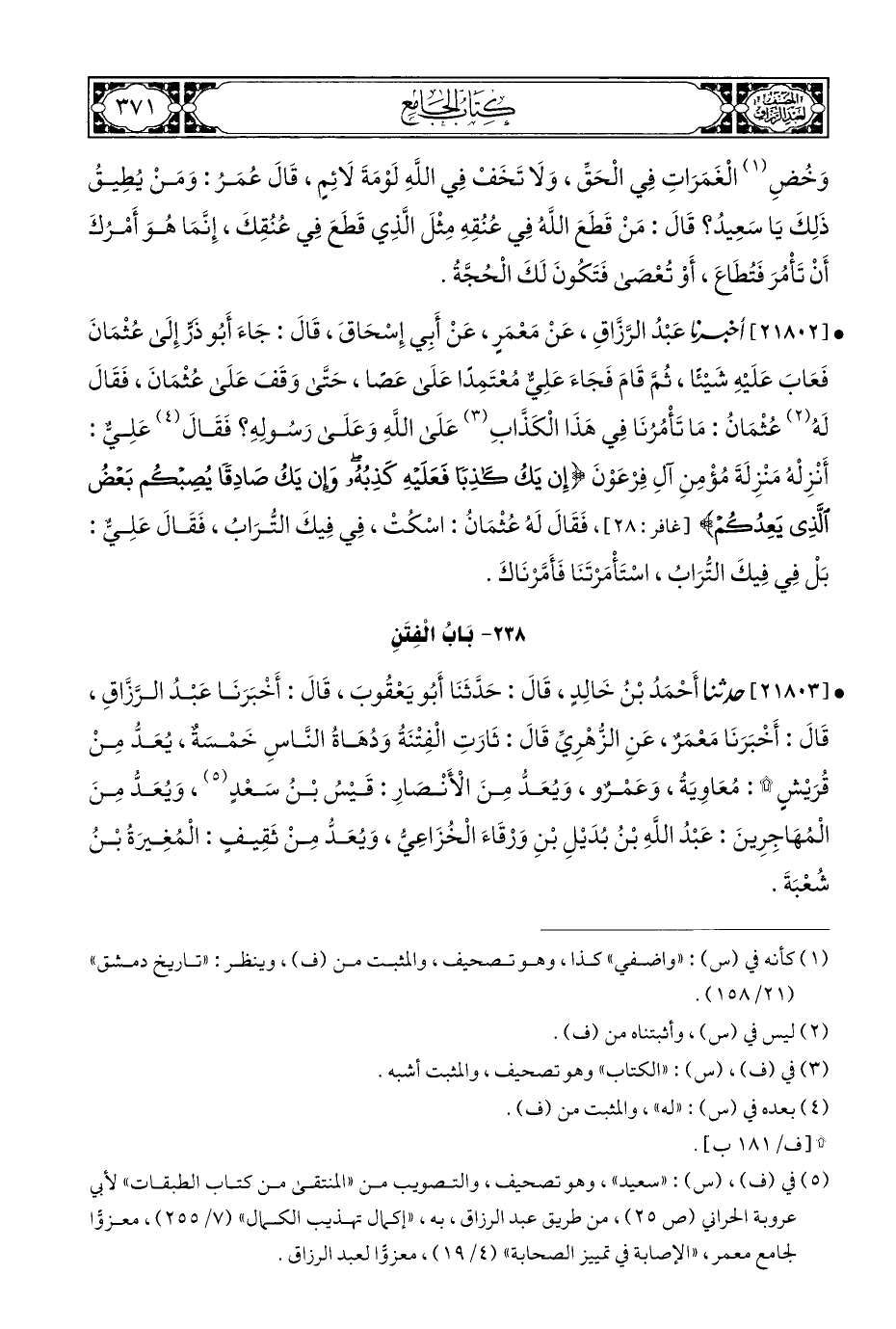 • [٢١٨٠٣] أخبرنا أَحْمَدُ بْنُ خَالِدٍ، قَالَ: حَدَّثَنَا أَبُو يَعْقُوبَ، قَالَ: أَخْبَرَنَا عَبْدُ الرَّزَّاقِ، قَالَ: أَخْبَرَنَا مَعْمَرٌ، عَنِ الزُّهْرِيِّ قَالَ: ثَارَتِ الْفِتْنَةُ وَدُهَاةُ النَّاسِ خَمْسَةٌ، يُعَدُّ مِنْ قُرَيْشٍ (*): مُعَاوِيَة، وَعَمْرٌو، وَيُعَدُّ مِنَ الْأَنْصارِ: قَيْسُ بْنُ سَعْدٍ (¬٥)، وَيُعَدُّ مِنَ الْمُهَاجِرِينَ: عَبْدُ اللهِ بْنُ بُدَيْلِ بْنِ وَرْقَاءَ الْخُزَاعِيّ، وَيُعَدُّ مِنْ ثَقِيفٍ: الْمُغِيرَةُ بْنُ شُعْبَةَ.