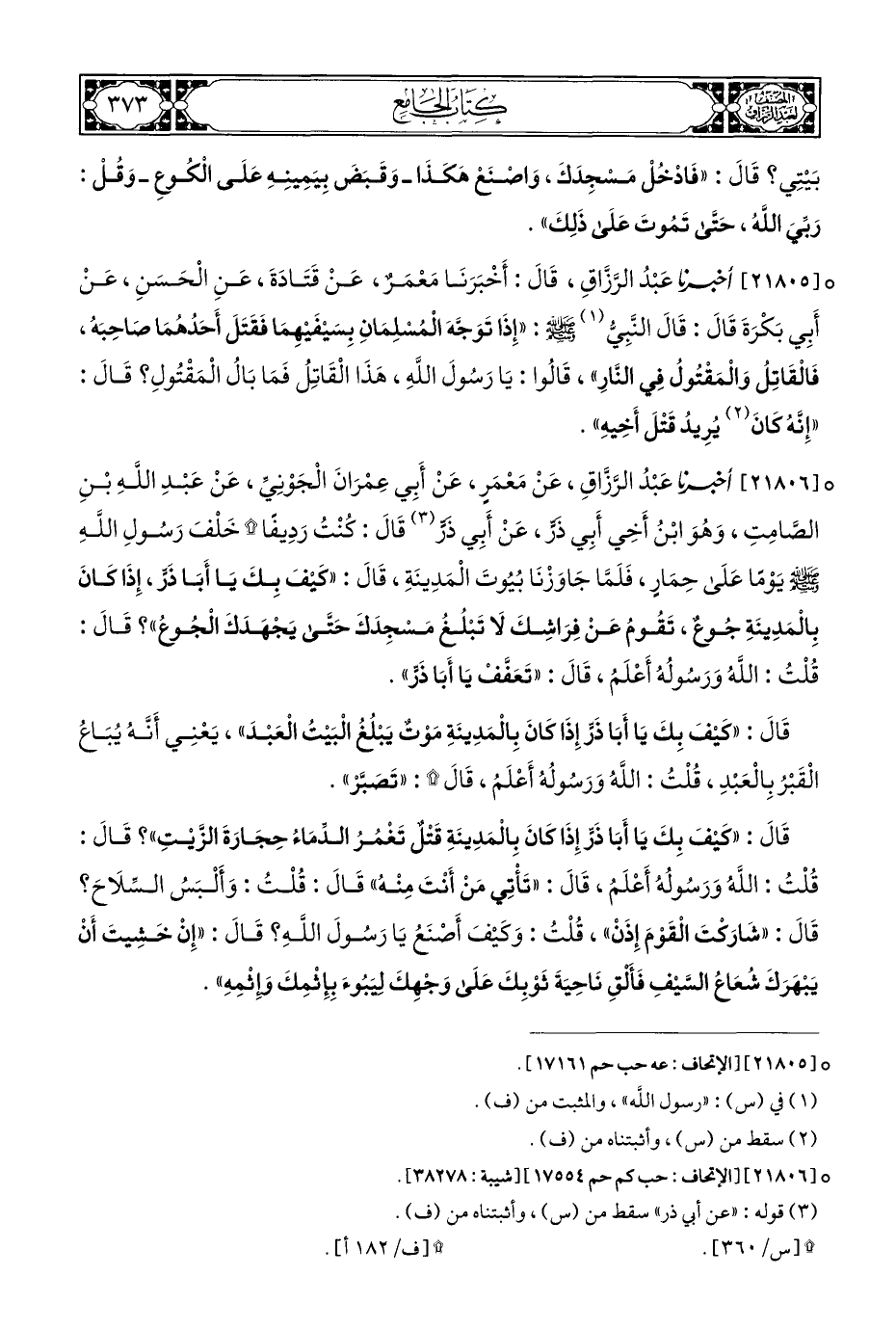 ° [٢١٨٠٥] أخبرنا عَبْدُ الرَّزَّاقِ، قَالَ: أَخْبَرَنَا مَعْمَرٌ، عَنْ قَتَادَةَ، عَنِ الْحَسَنِ، عَنْ أَبِي بَكْرَةَ قَالَ: قَالَ النَّبِيُّ (¬١) - صلى الله عليه وسلم -: "إِذَا تَوَجَّهَ الْمُسْلِمَانِ بِسَيْفَيْهِمَا فَقَتَلَ أَحَدُهُمَا صَاحِبَه، فَالْقَاتِلُ وَالْمَقْتُولُ فِي النَّارِ"، قَالُوا: يَا رَسُولَ اللهِ، هَذَا الْقَاتِلُ فَمَا بَالُ الْمَقْتُولِ؟ قَالَ: "إِنَّهُ كَانَ (¬٢) يُرِيدُ قَتْلَ أَخِيهِ".