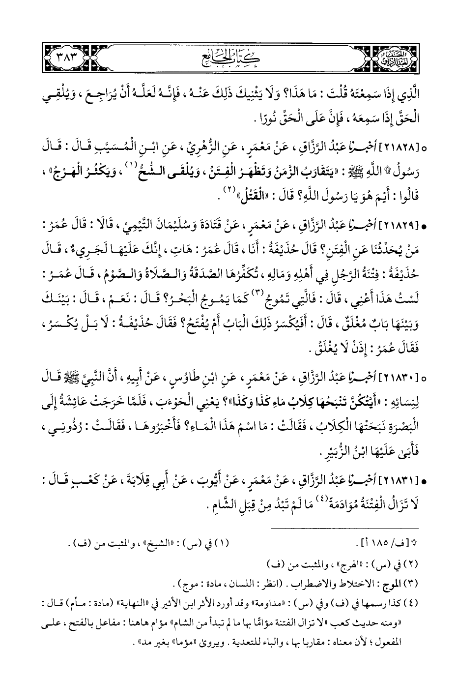 • [٢١٨٣١] أخبرنا عَبْدُ الرَّزَّاقِ، عَنْ مَعْمَرٍ، عَنْ أَيُّوبَ، عَنْ أَبِي قِلَابَةَ، عَنْ كَعْبٍ قَالَ: لَا تَزَالُ الْفِتْنَةُ مُوَادَمَةً (¬٤) مَا لَمْ تَبْدُ مِنْ قِبَلِ الشَّامِ.