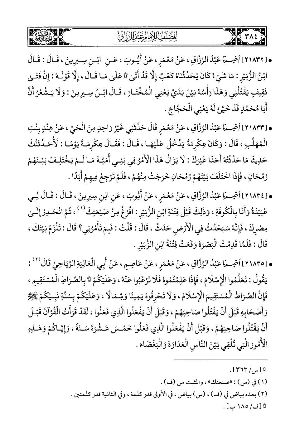 • [٢١٨٣٤] أخبرنا عَبْدُ الرَّزَّاقِ، عَنْ مَعْمَرٍ، عَنْ أَيُّوبَ، عَنِ ابْنِ سِيرِينَ، قَالَ: قَالَ لِي عُبَيْدَةُ وَأَنَا بِالْكُوفَةِ، وَذَلِكَ قَبْلَ فِتْنَةِ ابْنِ الزُّبَيْرِ: افْرُغْ مِنْ ضَيْعَتِكَ (¬١)، ثُمَّ انْحَدِرْ إِلَى مِصْرِكَ، فَإِنَّهُ سَيَحْدُثُ فِي الْأَرْضِ حَدَثٌ، قَالَ: قُلْتُ: فَبِمَ تَأْمُرُنِي؟ قَالَ: تَلْزَمُ بَيْتَكَ، قَالَ: فَلَمَّا قَدِمْتُ الْبَصرَةَ وَقَعَتْ فِتْنَةُ ابْنِ الزُّبَيْرِ.