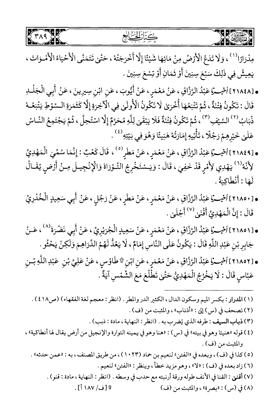 • [٢١٨٥٠] أخبرنا عَبْدُ الرَّزَّاقِ، عَنْ مَعْمَرٍ، عَنْ مَطَرِ، عَنْ رَجُلٍ، عَنْ أَبِي سَعِيدٍ الْخُدْرِيِّ قَالَ: إِنَّ الْمَهْدِيَّ أَقْنَى (¬٧) أَجْلَى.