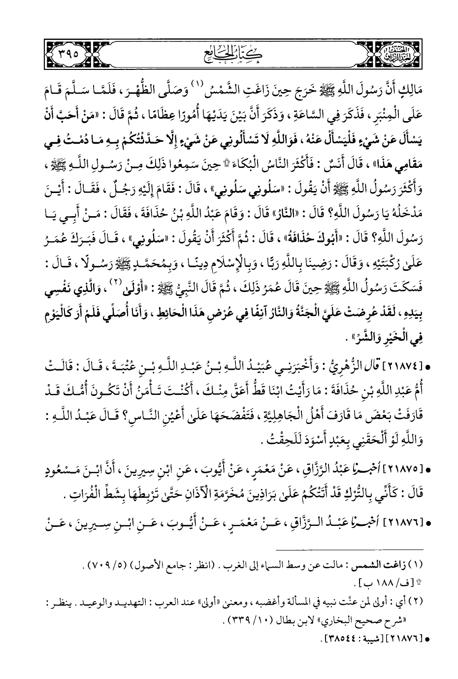مَالِكٍ أَنَّ رَسُولَ اللهِ - صلى الله عليه وسلم - خَرَجَ حِينَ زَاغَتِ الشَّمْسُ (¬١) وَصَلَّى الظُّهْرَ، فَلَمَّا سَلَّمَ قَامَ عَلَى الْمِنْبَرِ، فَذَكَرَ فِي السَّاعَةِ، وَذَكَرَ أَنَّ بَيْنَ يَدَيْهَا أُمُورًا عِظَامًا، ثُمَّ قَالَ: "مَنْ أَحَبَّ أَنْ يَسْأَلَ عَنْ شَيْءٍ فَلْيَسْأَلْ عَنْه، فَوَاللهِ لَا تَسْأَلُونِي عَنْ شَيْءٍ إِلَّا حَدَّثْتُكُمْ بِهِ مَا دُمْتُ فِي مَقَامِي هَذَا"، قَالَ أَنَسٌ: فَأَكْثَرَ النَّاسُ الْبُكَاءَ (*) حِينَ سَمِعُوا ذَلِكَ مِنْ رَسُولِ اللهِ - صلى الله عليه وسلم -، وَأَكْثَرَ رَسُولُ اللهِ - صلى الله عليه وسلم - أَنْ يَقُولَ: "سَلُونِي سَلُونِي"، قَالَ: فَقَامَ إِلَيْهِ رَجُلٌ، فَقَالَ: أَيْنَ مَدْخَلُهُ يَا رَسُولَ اللهِ؟ قَالَ: "النَّارُ" قَالَ: وَقَامَ عَبْدُ اللهِ بْنُ حُذَافَةَ، فَقَالَ: مَنْ أَبِي يَا رَسُولَ اللهِ؟ قَالَ: "أَبُوكَ حُذَافَةُ"، قَالَ: ثُمَّ أَكْثَرَ أَنْ يَقُولَ: "سَلُونِي"، قَالَ فَبَرَكَ عُمَرُ عَلَى رُكْبَتَيْهِ، وَقَالَ: رَضينَا بِاللهِ رَبًّا، وَبِالْإِسْلَامِ دِينًا، وَبِمُحَمَّدٍ - صلى الله عليه وسلم - رَسُولًا، قَالَ: فَسَكَتَ رَسُولُ اللهِ - صلى الله عليه وسلم - حِينَ قَالَ عُمَرُ ذَلِكَ، ثُمَّ قَالَ النَّبِيُّ - صلى الله عليه وسلم - "أَوْلَى (¬٢)، وَالَّذِي نَفْسِي بِيَدِهِ، لَقَدْ عُرِضَتْ عَلَيَّ الْجَنَّةُ وَالنَّارُ آنِفًا فِي عُرْضِ هَذَا الْحَائِطِ، وَأَنَا أُصَلِّي فَلَمْ أَرَ كَالْيَوْمِ فِي الْخَيْرِ وَالشَّرِّ".