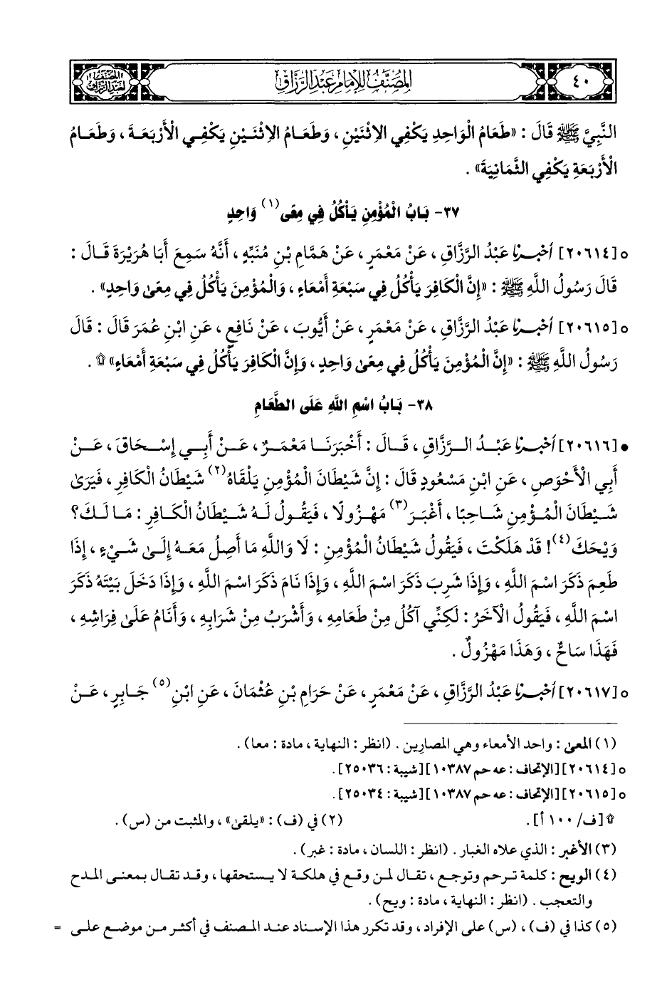 ° [٢٠٦١٥] أخبرنا عَبْدُ الرَّزَّاقِ، عَنْ مَعْمَرٍ، عَن أَيُّوبَ، عَنْ نَافِعٍ، عَنِ ابْنِ عُمَرَ قَالَ: قَالَ رَسُولُ اللهِ - صلى الله عليه وسلم -: "إِنَّ الْمُؤْمِنَ يَأْكُلُ فِي مِعًى وَاحِدٍ، وَإِنَّ الْكَافِرَ يَأكُلُ فِي سَبْعَةِ أَمْعَاءٍ" *.
