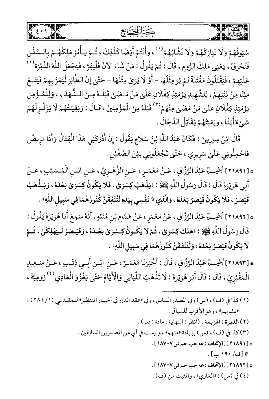 ° [٢١٨٩٢] أخبرنا عَبْدُ الرَّزَّاقِ، عَنْ مَعْمَرٍ، عَنْ هَمَّامِ بْنِ مُنَبِّهٍ، أَنَّهُ سَمِعَ أَبَا هُرَيْرَةَ يَقُولُ: قَالَ رَسُولُ اللهِ - صلى الله عليه وسلم -: "هَلَكَ كِسْرَى، ثُمَّ لَا يَكُونُ كِسْرَى بَعْدَه، وَقَيْصَرُ لَيَهْلِكَنَّ، ثُمَّ لَا يَكُونُ قَيْصَرُ بَعْدَه، وَلَتُنْفَقَنَّ كُنُوزُهُمَا فِي سَبِيلِ اللهِ".