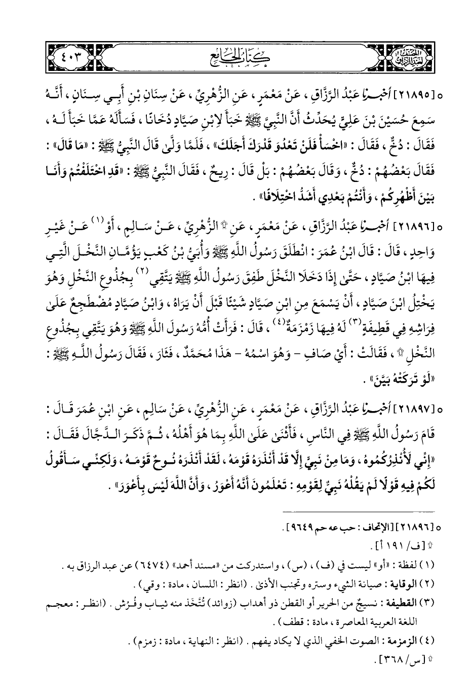 ° [٢١٨٩٦] أخبرنا عَبْدُ الرَّزَّاقِ، عَنْ مَعْمَرٍ، عَنِ (*) الزُّهْرِيِّ، عَنْ سَالِمٍ، أَوْ (¬١) عَنْ غَيْرِ وَاحِدٍ، قَالَ: قَالَ ابْنُ عُمَرَ: انْطَلَقَ رَسُولُ اللهِ - صلى الله عليه وسلم - وَأُبَيُّ بْنُ كَعْبٍ يَؤُمَّانِ النَّخْلَ الَّتِي فِيهَا ابْنُ صَيَّادٍ، حَتَّى إِذَا دَخَلَا النَّخْلَ طَفِقَ رَسُولُ اللهِ - صلى الله عليه وسلم - يَتَّقِي (¬٢) بِجُذُوعِ النَّخْلِ وَهُوَ يَخْتِلُ ابْنَ صَيَّادٍ، أَنْ يَسْمَعَ مِنِ ابْنِ صَيَّادٍ شَيْئًا قَبْلَ أَنْ يَرَاه، وَابْنُ صيَّادٍ مُضطَجِعٌ عَلَى فِرَاشِهِ فِي قَطِيفَةٍ (¬٣) لَهُ فِيهَا زَمْزَمَةٌ (¬٤)، قَالَ: فَرَأَتْ أُمُّهُ رَسُولَ اللهِ - صلى الله عليه وسلم - وَهُوَ يَتَّقِي بِجُذُوعِ النَّخْلِ (*)، فَقَالَتْ: أَيْ صَافِ - وَهُوَ اسْمُهُ - هَذَا مُحَمَّدٌ، فَثَارَ، فَقَالَ رَسُولُ اللهِ - صلى الله عليه وسلم -: "لَوْ تَرَكَتْهُ بَيَّنَ".