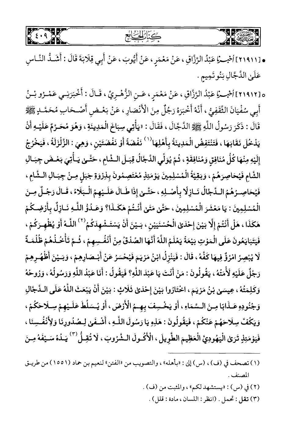 ° [٢١٩١٢] أخبرنا عَبْدُ الرَّزَّاقِ، عَنْ مَعْمَرٍ، عَنِ الزُّهْرِيِّ، قَالَ: أَخْبَرَنِي عَمْرُو بْنُ أَبِي سُفْيَانَ الثَّقَفِيُّ، أَنَّهُ أَخْبَرَهُ رَجُلٌ مِنَ الْأَنْصَارِ، عَنْ بَعْضِ أَصْحَابِ مُحَمَّدٍ - صلى الله عليه وسلم - قَالَ: ذَكَرَ رَسُولُ اللهِ - صلى الله عليه وسلم - الدَّجَّالَ، فَقَالَ: "يَأْتِي سِبَاخَ الْمَدِينَةِ، وَهُوَ مُحَرَّمٌ عَلَيْهِ أَنْ يَدْخُلَ نَقَابَهَا، فَتَنْتَفِضُ الْمَدِينَةُ بِأَهْلِهَا (¬١) نَفْضَةً أَوْ نَفْضَتَيْنِ، وَهِيَ: الزَّلْزَلَة، فَيَخْرُجُ إِلَيْهِ مِنْهَا كُلُّ مُنَافِقٍ وَمُنَافِقَةٍ، ثُمَّ يُوَلِّي الدَّجَّالُ قِبَلَ الشَّامِ، حَتَّى يَأْتِيَ بَعْضَ جِبَالِ الشَّامِ فَيُحَاصِرَهُمْ، وَبَقِيَّةُ الْمُسْلِمِينَ يَوْمَئِذٍ مُعْتَصِمُونَ بِذِرْوَةِ جَبَلٍ مِنْ جِبَالِ الشَّامِ، فَيُحَاصِرُهُمُ الدَّجَّالُ نَازِلًا بِأَصْلِهِ، حَتَّى إِذَا طَالَ عَلَيْهِمُ الْبَلَاء، قَالَ رَجُلٌ مِنَ الْمُسْلِمِينَ: يَا مَعْشَرَ الْمُسْلِمِينَ، حَتَّى مَتَى أَنْتُمْ هَكَذَا؟ وَعَدُوُّ اللهِ نَازِلٌ بِأَرْضِكُمْ هَكَذَا، هَلْ أَنْتُمْ إِلَّا بَيْنَ إِحْدَى الْحُسْنَيَيْنِ، بَيْنَ أَنْ يَسْتَشْهِدَكُمُ (¬٢) اللهُ أَوْ يُظْهِرَكُمْ، فَيَتَبَايَعُونَ عَلَى الْمَوْتِ بَيْعَةً يَعْلَمُ اللهُ أَنَّهَا الصِّدْقُ مِنْ أَنْفُسِهِمْ، ثُمَّ تَأْخُذُهُمْ ظُلْمَةٌ لَا يُبْصِرُ امْرُؤٌ فِيهَا كفَّه، قَالَ: فَيَنْزِلُ ابْنُ مَرْيَمَ فَيُحْسَرُ عَنْ أَبْصَارِهِمْ، وَبَيْنَ أَظْهُرِهِمْ رَجُلٌ عَلَيْهِ لأْمَتُه، يَقُولُونَ: مَنْ أَنْتَ يَا عَبْدَ اللهِ؟ فَيَقُولُ: أَنَا عَبْدُ اللهِ وَرَسُولُه، وَرُوحُهُ وَكَلِمَتُه، عِيسَى بْنُ مَرْيَمَ، اخْتَارُوا بَيْنَ إِحْدَى ثَلَاثٍ: بَيْنَ أَنْ يَبْعَثَ اللهُ عَلَى الدَّجَّالِ وَجُنُودِهِ عَذَابًا مِنَ السَّمَاءِ، أَوْ يَخْسِفَ بِهِمُ الْأَرْضَ، أَوْ يُسَلِّطَ عَلَيْهِمْ سِلَاحَكُمْ، وَيَكُفَّ سِلَاحَهُمْ عَنْكُمْ، فَيَقُولُونَ: هَذِهِ يَا رَسُولَ اللهِ، أَشْفَى لِصُدُورِنَا وَلِأَنْفُسِنَا، فَيَوْمَنِذٍ تَرَى الْيَهُودِيَّ الْعَظِيمَ الطَّوِيلَ، الْأَكُولَ الشَّرُوبَ، لَا تُقِلُّ (¬٣) يَدُهُ سَيْفَهُ مِنَ