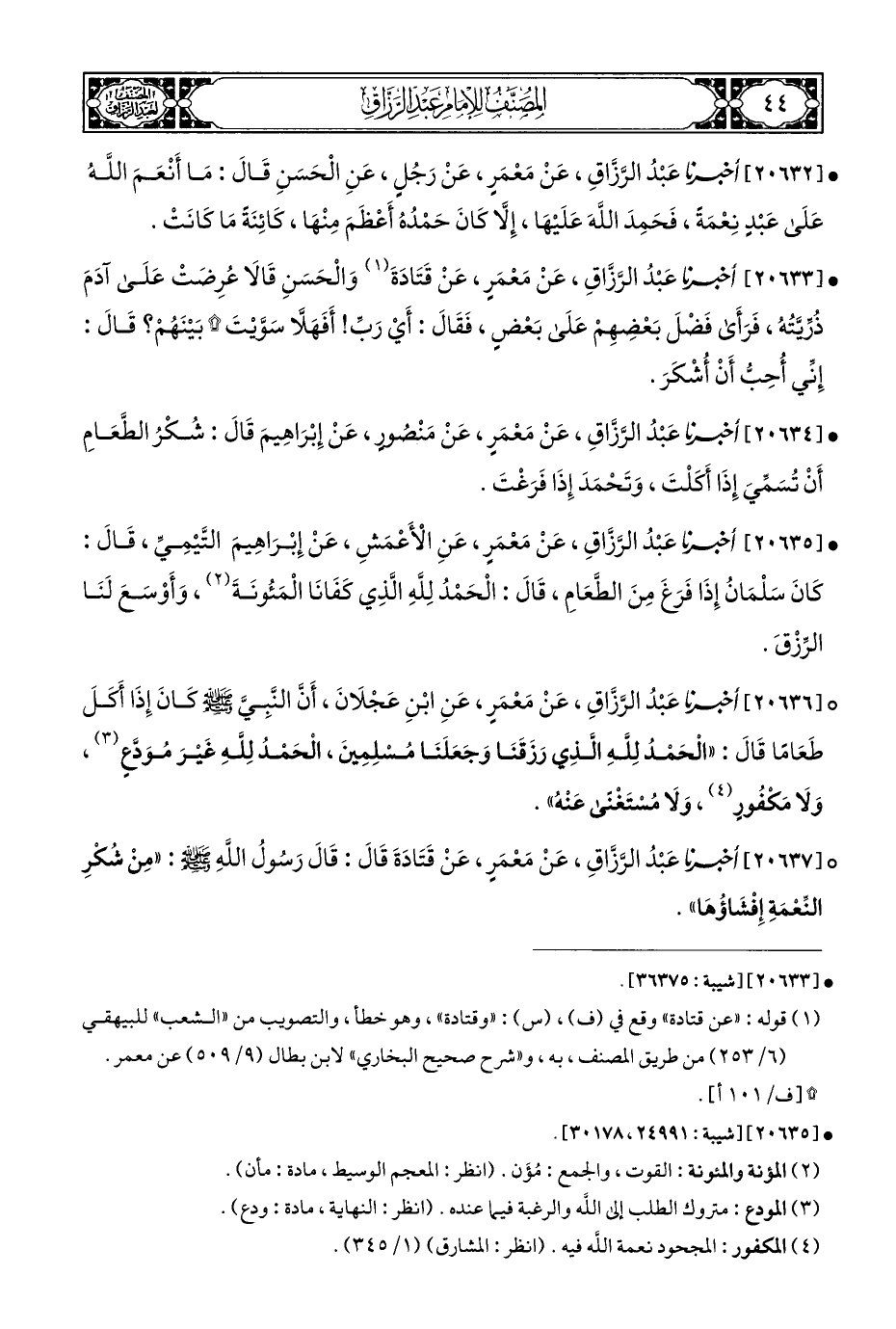 • [٢٠٦٣٥] أخبرنا عَبْدُ الرَّزَّاقِ، عَنْ مَعْمَرٍ، عَنِ الْأَعْمَشِ، عَنْ إِبْرَاهِيمَ التَّيْمِيِّ، قَالَ: كَانَ سَلْمَانُ إِذَا فَرَغَ مِنَ الطَّعَامِ، قَالَ: الْحَمْدُ لِلَّهِ الَّذِي كَفَانَا الْمَئُونَةَ (¬٢)، وَأَوْسَعَ لَنَا الرِّزْقَ.
