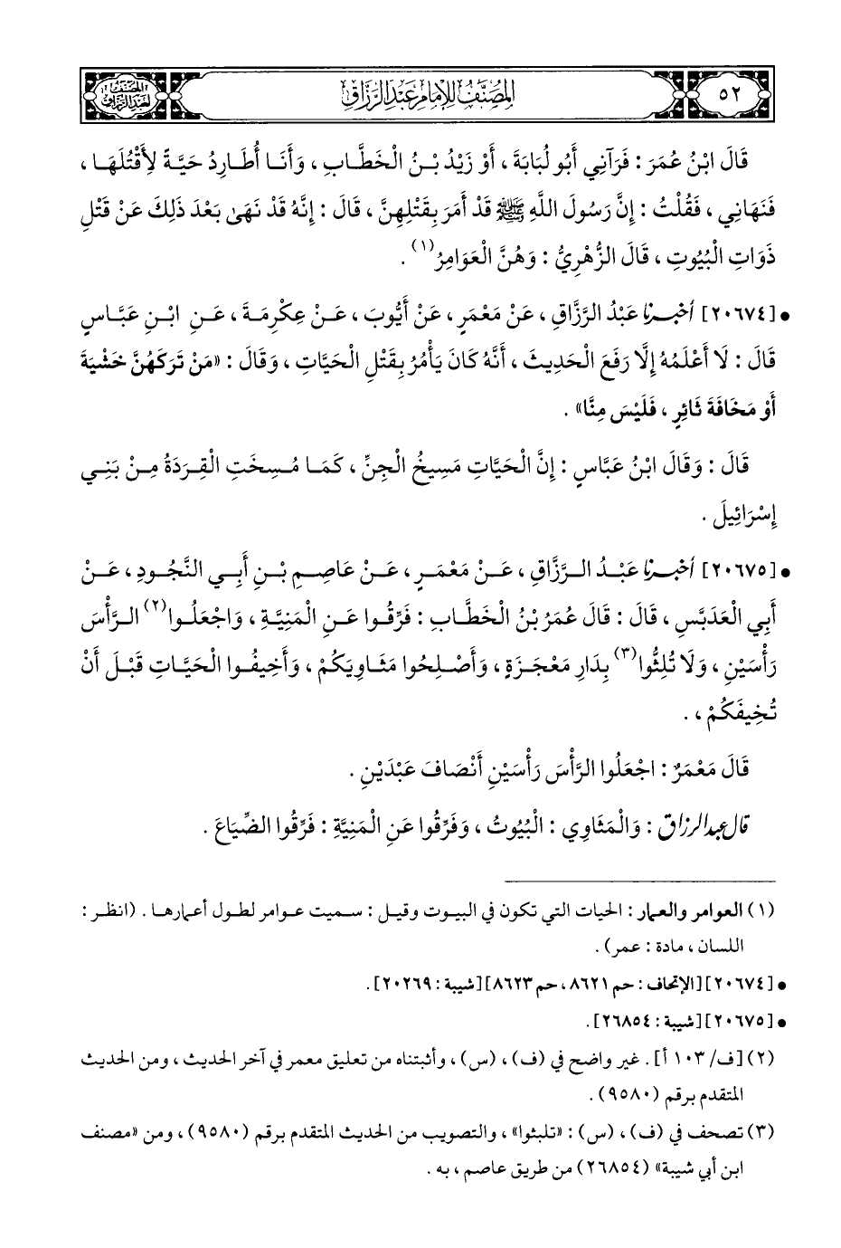 • [٢٠٦٧٥] أخبرنا عَبْدُ الرَّزَّاقِ، عَنْ مَعْمَر، عَنْ عَاصِمِ بْنِ أَبِي النَّجُودِ، عَنْ أَبِي الْعَدَبَّسِ، قَالَ: قَالَ عُمَرُ بْنُ الْخَطَّابِ: فَرِّقُوا عَنِ الْمَنِيَّةِ، وَاجْعَلُوا (¬٢) الرَّأْسَ رَأْسَيْنِ، وَلَا تُلِثُّوا (¬٣) بِدَارِ مَعْجَزَةٍ، وَأَصلِحُوا مَثَاوِيَكُمْ، وَأَخِيفُوا الْحَيَّاتِ قَبْلَ أَنْ تُخِيفَكُمْ.