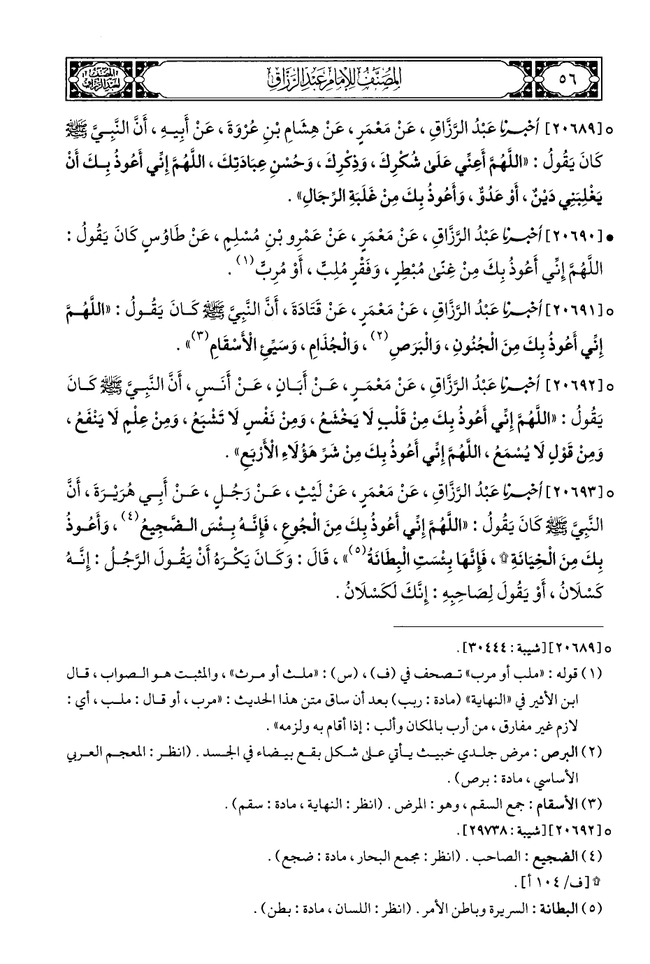 ° [٢٠٦٩١] عَبْدُ الرَّزَّاقِ، عَنْ مَعْمَرٍ، عَنْ قَتَادَةَ، أَنَّ النَّبِيَّ - صلى الله عليه وسلم - كَانَ يَقُولُ: "اللَّهُمَّ إِنِّي أَعُوذُ بِكَ مِنَ الْجُنُونِ، وَالْبَرَصِ (¬٢)، وَالْجُذَامِ، وَسَيِّئِ الْأَسْقَامِ (¬٣) ".