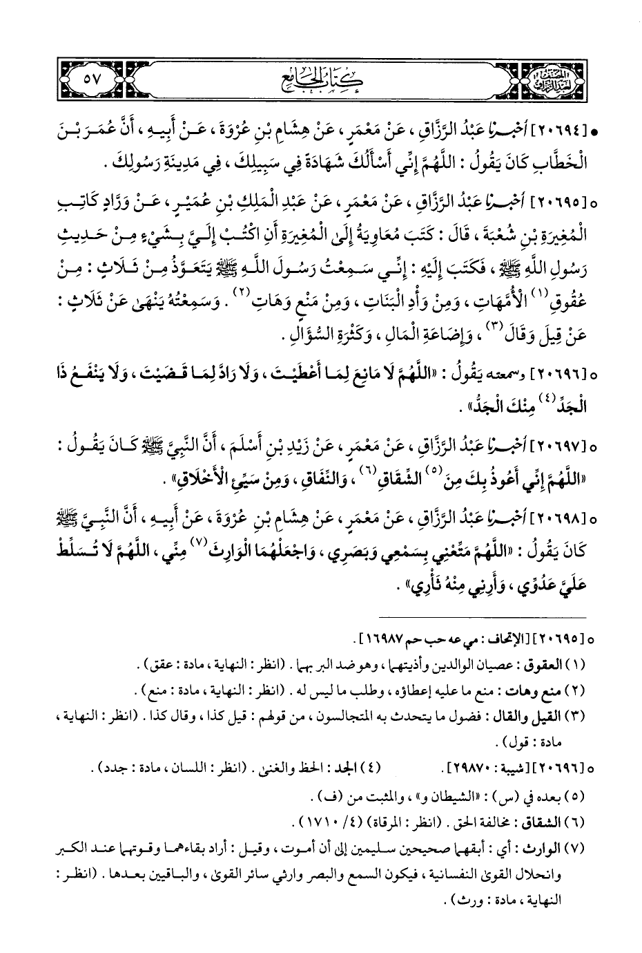 ° [٢٠٦٩٧] أخبرنا عَبْدُ الرَّزَّاقِ، عَنْ مَعْمَرٍ، عَنْ زَيْدِ بْنِ أَسْلَمَ، أَنَّ النَّبِيَّ - صلى الله عليه وسلم - كَانَ يَقُولُ: "اللَّهُمَّ إِنِّي أَعُوذُ بِكَ مِنَ (¬٥) الشِّقَاقِ (¬٦)، وَالنِّفَاقِ، وَمِنْ سَيِّئِ الْأَخْلَاقِ".