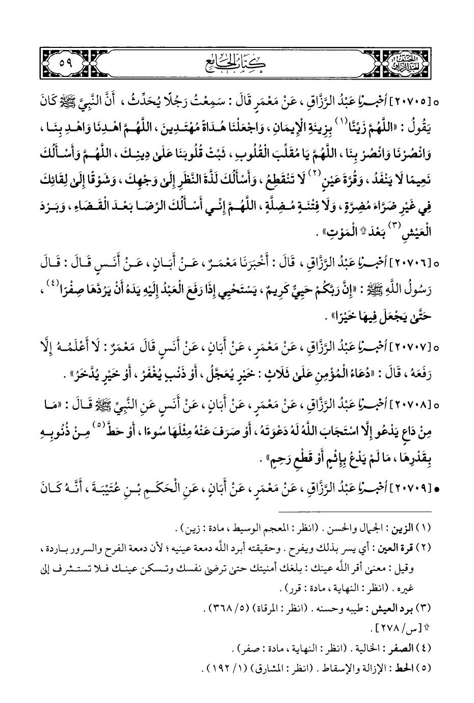° [٢٠٧٠٥] أخبرنا عَبْدُ الرَّزَّاقِ، عَنْ مَعْمَرِ قَالَ: سَمِعْتُ رَجُلًا يُحَدِّث، أَنَّ النَّبِيَّ - صلى الله عليه وسلم - كَانَ يَقُولُ: "اللَّهُمَّ زَيِّنَّا (¬١) بِزِينَةِ الْإِيمَانِ، وَاجْعَلْنَا هُدَاةً مُهْتَدِينَ، اللَّهُمَّ اهْدِنَا وَاهْدِ بِنَا، وَانْصُرْنَا وَانْصُرْ بِنَا، اللَّهُمَّ يَا مُقَلِّبَ الْقُلُوبِ، ثَبِّتْ قُلُوبَنَا عَلَى دِينِكَ، اللَّهُمَّ وَأَسْألكَ نَعِيمًا لَا يَنْفَدُ، وَقُرَّةَ عَيْنِ (¬٢) لَا تَنْقَطِع، وَأَسْأَلُكَ لَذَّةَ النَّظَرِ إِلَى وَجْهِكَ، وَشَوْقًا إِلَى لِقَائِكَ فِي غَيْرِ ضَرَّاءَ مُضِرَّةٍ، وَلَا فِتْنَةٍ مُضِلَّةٍ، اللَّهُمَّ إِنِّي أَسْأَلُكَ الرِّضَا بَعْدَ الْقَضَاءِ، وَبَرْدَ الْعَيْشِ (¬٣) بَعْدَ * الْمَوْتِ".